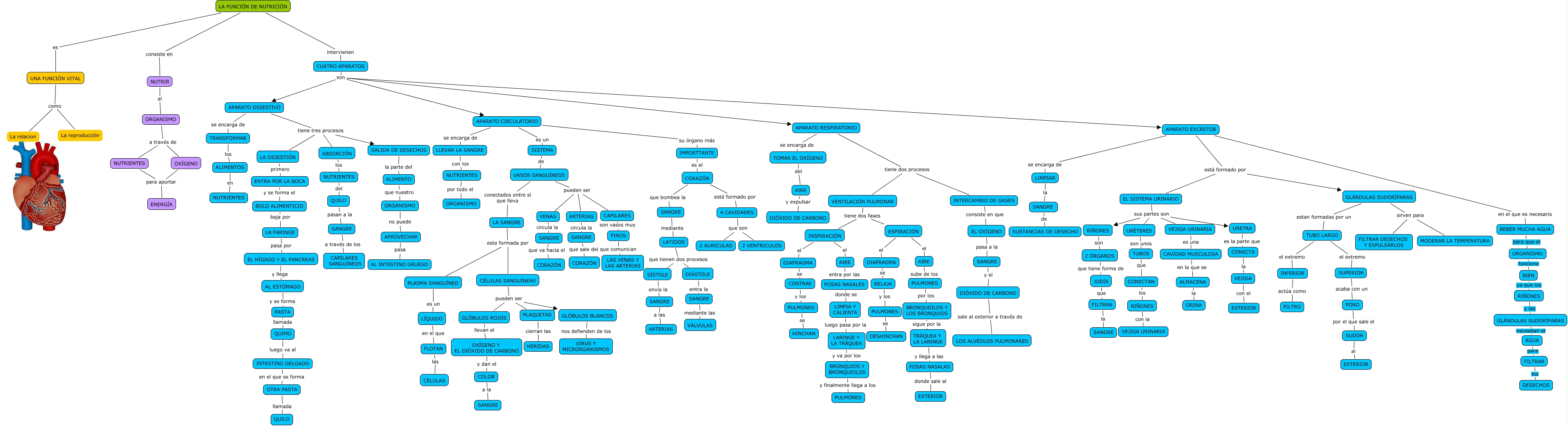 Este Cmap, tiene información relacionada con: LA FUNCIÓN DE NUTRICIÓN-Lucía M, ESPIRACIÓN el AIRE, LA DIGESTIÓN primero ENTRA POR LA BOCA, LIMPIA Y CALIENTA luego pasa por la LARINGE Y LA TRÁQUEA, 2 ÓRGANOS que tiene forma de JUDÍA, LA FARINGE pasa por EL HÍGADO Y EL PANCREAS, VENTILACIÓN PULMONAR tiene dos fases ESPIRACIÓN, APARATO EXCRETOR está formado por EL SISTEMA URINARIO, VENAS circula la SANGRE, TRÁQUEA Y LA LARINGE y llega a las FOSAS NASALAS, SÍSTOLE envía la SANGRE, VEJIGA con el EXTERIOR, NUTRIR al ORGANISMO, VASOS SANGUÍNEOS pueden ser VENAS, ARTERIAS circula la SANGRE, CONECTA la VEJIGA, CORAZÓN está formado por 4 CAVIDADES, RELAJA y los PULMONES, TRANSFORMAR los ALIMENTOS, APARATO EXCRETOR se encarga de LIMPIAR, VEJIGA URINARIA es una CAVIDAD MUSCULOSA