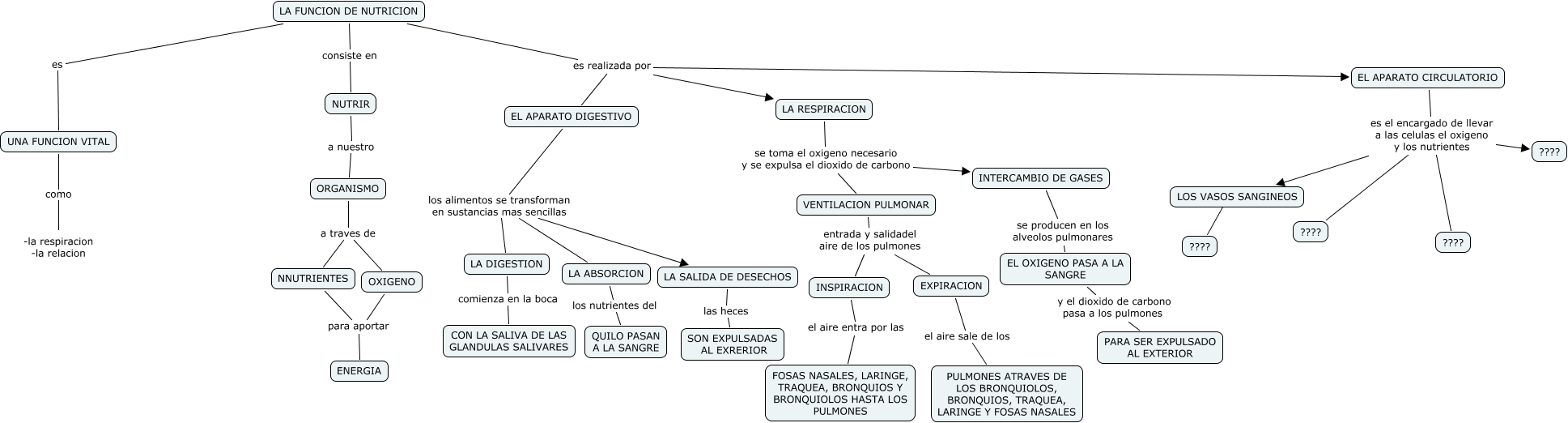 Este Cmap, tiene información relacionada con: LA FUNCION DE NUTRICION-Raúl, LOS VASOS SANGINEOS ???? ????, INTERCAMBIO DE GASES se producen en los alveolos pulmonares EL OXIGENO PASA A LA SANGRE, LA FUNCION DE NUTRICION es UNA FUNCION VITAL, UNA FUNCION VITAL como -la respiracion -la relacion, VENTILACION PULMONAR entrada y salidadel aire de los pulmones EXPIRACION, LA FUNCION DE NUTRICION es realizada por EL APARATO DIGESTIVO, INSPIRACION el aire entra por las FOSAS NASALES, LARINGE, TRAQUEA, BRONQUIOS Y BRONQUIOLOS HASTA LOS PULMONES, NUTRIR a nuestro ORGANISMO, EL APARATO DIGESTIVO los alimentos se transforman en sustancias mas sencillas LA DIGESTION, LA ABSORCION los nutrientes del QUILO PASAN A LA SANGRE, EL APARATO DIGESTIVO los alimentos se transforman en sustancias mas sencillas LA SALIDA DE DESECHOS, EL APARATO CIRCULATORIO es el encargado de llevar a las celulas el oxigeno y los nutrientes ????, LA FUNCION DE NUTRICION es realizada por EL APARATO CIRCULATORIO, LA RESPIRACION se toma el oxigeno necesario y se expulsa el dioxido de carbono INTERCAMBIO DE GASES, LA FUNCION DE NUTRICION consiste en NUTRIR, EL APARATO CIRCULATORIO es el encargado de llevar a las celulas el oxigeno y los nutrientes LOS VASOS SANGINEOS, LA FUNCION DE NUTRICION es realizada por LA RESPIRACION, EL OXIGENO PASA A LA SANGRE y el dioxido de carbono pasa a los pulmones PARA SER EXPULSADO AL EXTERIOR, LA DIGESTION comienza en la boca CON LA SALIVA DE LAS GLANDULAS SALIVARES, EL APARATO CIRCULATORIO es el encargado de llevar a las celulas el oxigeno y los nutrientes ????