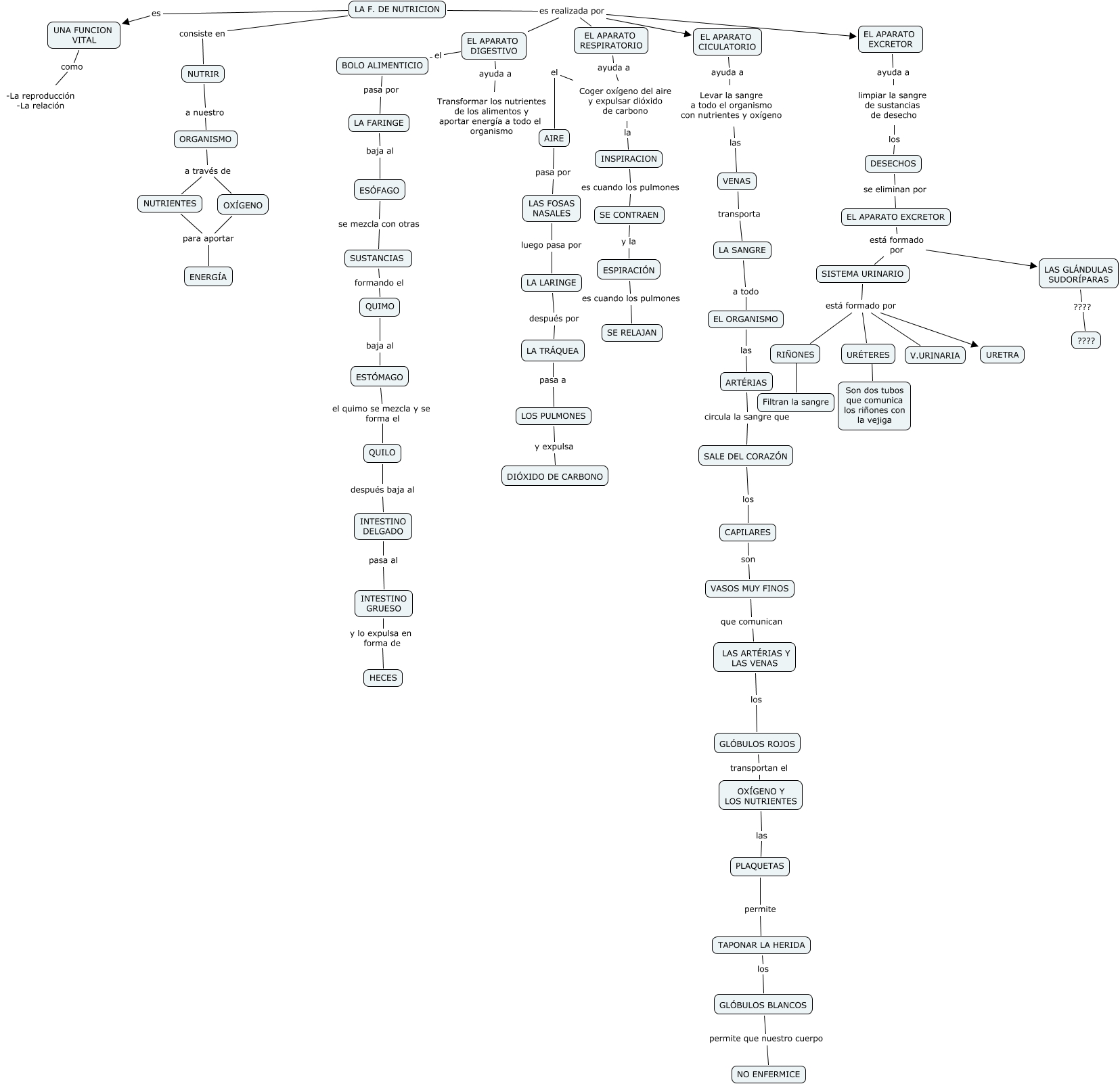 Este Cmap, tiene información relacionada con: LA FUNCION DE NUTRICIÓN-Eduardo, Coger oxígeno del aire y expulsar dióxido de carbono el AIRE, LA FARINGE baja al ESÓFAGO, VENAS transporta LA SANGRE, URÉTERES ???? Son dos tubos que comunica los riñones con la vejiga, LOS PULMONES y expulsa DIÓXIDO DE CARBONO, NUTRIENTES para aportar ENERGÍA, CAPILARES son VASOS MUY FINOS, RIÑONES ???? Filtran la sangre, LAS ARTÉRIAS Y LAS VENAS los GLÓBULOS ROJOS, AIRE pasa por LAS FOSAS NASALES, BOLO ALIMENTICIO pasa por LA FARINGE, SISTEMA URINARIO está formado por URÉTERES, LAS FOSAS NASALES luego pasa por LA LARINGE, EL APARATO DIGESTIVO el BOLO ALIMENTICIO, Levar la sangre a todo el organismo con nutrientes y oxígeno las VENAS, SUSTANCIAS formando el QUIMO, LA F. DE NUTRICION es realizada por EL APARATO RESPIRATORIO, EL APARATO DIGESTIVO ayuda a Transformar los nutrientes de los alimentos y aportar energía a todo el organismo, QUIMO baja al ESTÓMAGO, ESPIRACIÓN es cuando los pulmones SE RELAJAN