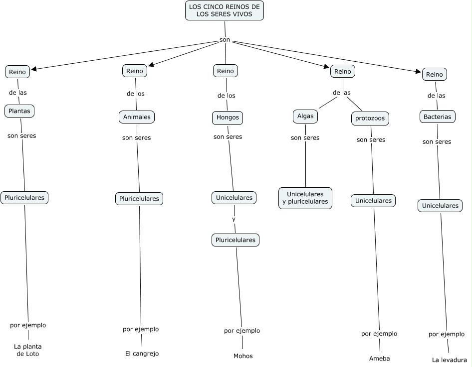 Este Cmap, tiene información relacionada con: LOS CINCO REINOS DE LOS SERES VIVOS-(Martina y Lucas), LOS CINCO REINOS DE LOS SERES VIVOS son Reino, Animales son seres Pluricelulares, Unicelulares y Pluricelulares, Bacterias son seres Unicelulares, Reino de las Plantas, Algas son seres Unicelulares y pluricelulares, Reino de las Algas, Reino de las protozoos, LOS CINCO REINOS DE LOS SERES VIVOS son Reino, Pluricelulares por ejemplo El cangrejo, Hongos son seres Unicelulares, Pluricelulares por ejemplo La planta de Loto, Unicelulares por ejemplo Ameba, LOS CINCO REINOS DE LOS SERES VIVOS son Reino, Plantas son seres Pluricelulares, Reino de los Animales, Pluricelulares por ejemplo Mohos, Reino de las Bacterias, LOS CINCO REINOS DE LOS SERES VIVOS son Reino, protozoos son seres Unicelulares