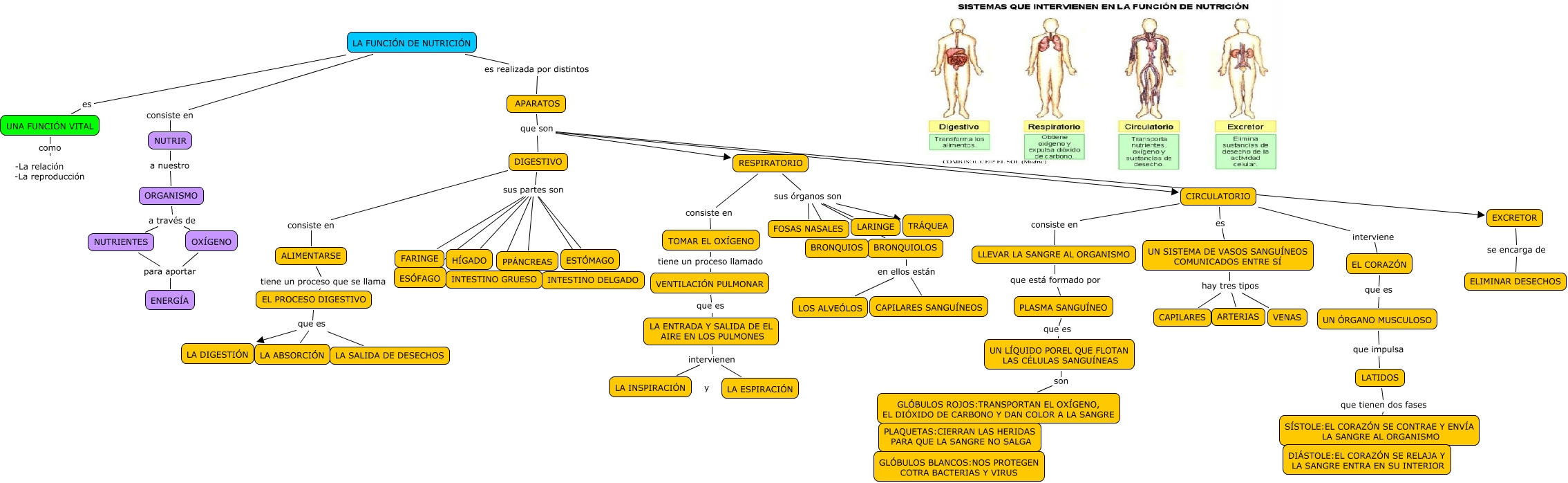 Este Cmap, tiene información relacionada con: LA FUNCIÓN DE NUTRICIÓN-Lucía F, APARATOS que son DIGESTIVO, APARATOS que son CIRCULATORIO, RESPIRATORIO sus órganos son LARINGE, UN SISTEMA DE VASOS SANGUÍNEOS COMUNICADOS ENTRE SÍ hay tres tipos VENAS, EL PROCESO DIGESTIVO que es LA DIGESTIÓN, LATIDOS que tienen dos fases SÍSTOLE:EL CORAZÓN SE CONTRAE Y ENVÍA LA SANGRE AL ORGANISMO, OXÍGENO para aportar ENERGÍA, UN ÓRGANO MUSCULOSO que impulsa LATIDOS, DIGESTIVO consiste en ALIMENTARSE, EL CORAZÓN que es UN ÓRGANO MUSCULOSO, EL PROCESO DIGESTIVO que es LA SALIDA DE DESECHOS, DIGESTIVO sus partes son INTESTINO DELGADO, DIGESTIVO sus partes son ESTÓMAGO, CIRCULATORIO interviene EL CORAZÓN, DIGESTIVO sus partes son PPÁNCREAS, UN SISTEMA DE VASOS SANGUÍNEOS COMUNICADOS ENTRE SÍ hay tres tipos ARTERIAS, APARATOS que son EXCRETOR, ALIMENTARSE tiene un proceso que se llama EL PROCESO DIGESTIVO, PLASMA SANGUÍNEO que es UN LÍQUIDO POREL QUE FLOTAN LAS CÉLULAS SANGUÍNEAS, PLAQUETAS:CIERRAN LAS HERIDAS PARA QUE LA SANGRE NO SALGA ???? GLÓBULOS BLANCOS:NOS PROTEGEN COTRA BACTERIAS Y VIRUS