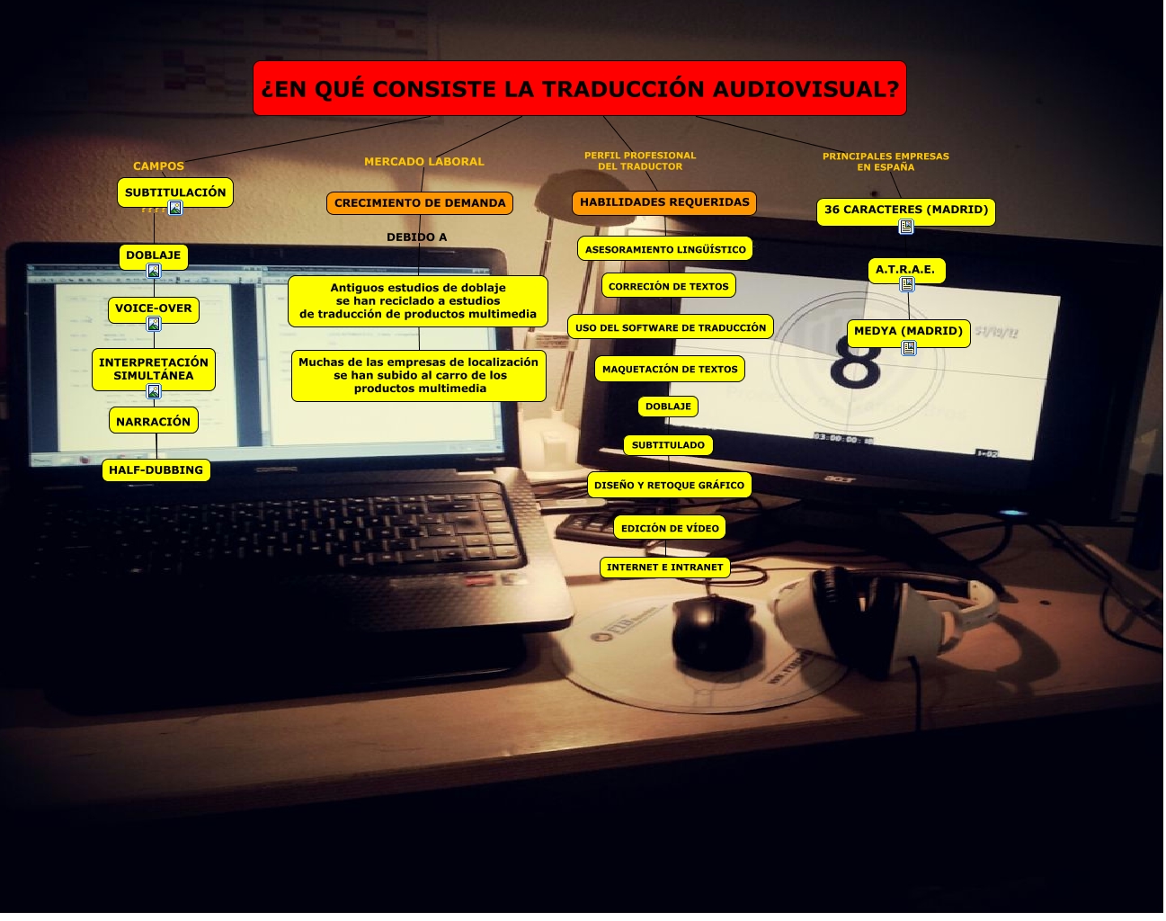 Este Cmap, tiene información relacionada con: TRADUCCIÓN AUDIOVISUAL, HABILIDADES REQUERIDAS ???? ASESORAMIENTO LINGÜÍSTICO, NARRACIÓN ???? INTERPRETACIÓN SIMULTÁNEA, 36 CARACTERES (MADRID) ???? A.T.R.A.E., SUBTITULADO ???? DISEÑO Y RETOQUE GRÁFICO, ¿EN QUÉ CONSISTE LA TRADUCCIÓN AUDIOVISUAL? CAMPOS SUBTITULACIÓN, ASESORAMIENTO LINGÜÍSTICO ???? CORRECIÓN DE TEXTOS, INTERPRETACIÓN SIMULTÁNEA ???? NARRACIÓN, ¿EN QUÉ CONSISTE LA TRADUCCIÓN AUDIOVISUAL? PERFIL PROFESIONAL DEL TRADUCTOR HABILIDADES REQUERIDAS, DISEÑO Y RETOQUE GRÁFICO ???? EDICIÓN DE VÍDEO, VOICE-OVER ???? INTERPRETACIÓN SIMULTÁNEA, EDICIÓN DE VÍDEO ???? INTERNET E INTRANET, ¿EN QUÉ CONSISTE LA TRADUCCIÓN AUDIOVISUAL? PRINCIPALES EMPRESAS EN ESPAÑA 36 CARACTERES (MADRID), DOBLAJE ???? SUBTITULADO, Antiguos estudios de doblaje se han reciclado a estudios de traducción de productos multimedia ???? Muchas de las empresas de localización se han subido al carro de los productos multimedia, USO DEL SOFTWARE DE TRADUCCIÓN ???? MAQUETACIÓN DE TEXTOS, HALF-DUBBING ???? NARRACIÓN, NARRACIÓN ???? HALF-DUBBING, CRECIMIENTO DE DEMANDA DEBIDO A Antiguos estudios de doblaje se han reciclado a estudios de traducción de productos multimedia, A.T.R.A.E. ???? MEDYA (MADRID), DOBLAJE ???? VOICE-OVER