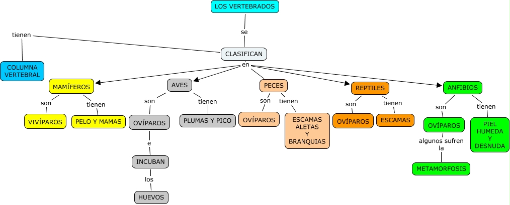 Este Cmap, tiene información relacionada con: LOS VERTEBRADOS (Unax), CLASIFICAN en ANFIBIOS, LOS VERTEBRADOS se CLASIFICAN, REPTILES son OVÍPAROS, CLASIFICAN en AVES, AVES son OVÍPAROS, INCUBAN los HUEVOS, PECES tienen ESCAMAS ALETAS Y BRANQUIAS, REPTILES tienen ESCAMAS, MAMÍFEROS tienen PELO Y MAMAS, PECES son OVÍPAROS, AVES tienen PLUMAS Y PICO, OVÍPAROS algunos sufren la METAMORFOSIS, CLASIFICAN en PECES, CLASIFICAN en REPTILES, MAMÍFEROS son VIVÍPAROS, CLASIFICAN en MAMÍFEROS, CLASIFICAN tienen COLUMNA VERTEBRAL, ANFIBIOS tienen PIEL HUMEDA Y DESNUDA, OVÍPAROS e INCUBAN, ANFIBIOS son OVÍPAROS