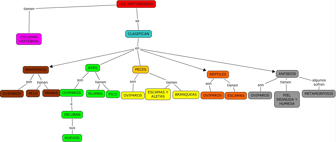 Este Cmap, tiene información relacionada con: LOS VERTEBRADOS(Gabriel), PECES tienen ESCAMAS Y ALETAS, LOS VERTEBRADOS se CLASIFICAN, MAMIFEROS son OVIPAROS, CLASIFICAN en PECES, AVES tienen PICO, AVES son OVIPAROS, CLASIFICAN en REPTILES, PECES tienen BRANQUEAS, CLASIFICAN en ANFIBIOS, OVIPAROS e INCUBAN, INCUBAN sus HUEVOS, ANFIBIOS tienen PIEL DESNUDA Y HUMEDA, REPTILES tienen ESCAMAS, PECES son OVIPAROS, REPTILES son OVIPAROS, MAMIFEROS tienen MAMAS, CLASIFICAN en MAMIFEROS, LOS VERTEBRADOS tienen COLUMNA VERTEBRAL, ANFIBIOS son OVIPAROS, AVES tienen PLUMAS
