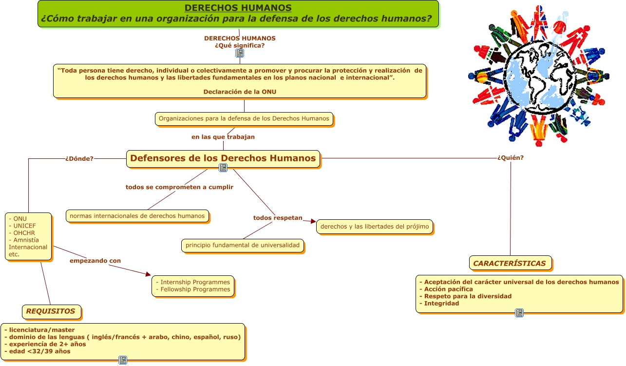 Questa Cmap, creata con IHMC CmapTools, contiene informazioni relative a: Riganti - trabajo final, Defensores de los Derechos Humanos todos respetan principio fundamental de universalidad, - ONU - UNICEF - OHCHR - Amnistía Internacional etc. empezando con - Internship Programmes - Fellowship Programmes, Defensores de los Derechos Humanos ¿Quién? CARACTERÍSTICAS, DERECHOS HUMANOS ¿Cómo trabajar en una organización para la defensa de los derechos humanos? DERECHOS HUMANOS ¿Qué significa? “Toda persona tiene derecho, individual o colectivamente a promover y procurar la protección y realización de los derechos humanos y las libertades fundamentales en los planos nacional e internacional”. Declaración de la ONU, Defensores de los Derechos Humanos ¿Dónde? - ONU - UNICEF - OHCHR - Amnistía Internacional etc., “Toda persona tiene derecho, individual o colectivamente a promover y procurar la protección y realización de los derechos humanos y las libertades fundamentales en los planos nacional e internacional”. Declaración de la ONU existen Organizaciones para la defensa de los Derechos Humanos, Defensores de los Derechos Humanos todos respetan derechos y las libertades del prójimo, - ONU - UNICEF - OHCHR - Amnistía Internacional etc. ???? REQUISITOS, Defensores de los Derechos Humanos todos se comprometen a cumplir normas internacionales de derechos humanos, Organizaciones para la defensa de los Derechos Humanos en las que trabajan Defensores de los Derechos Humanos