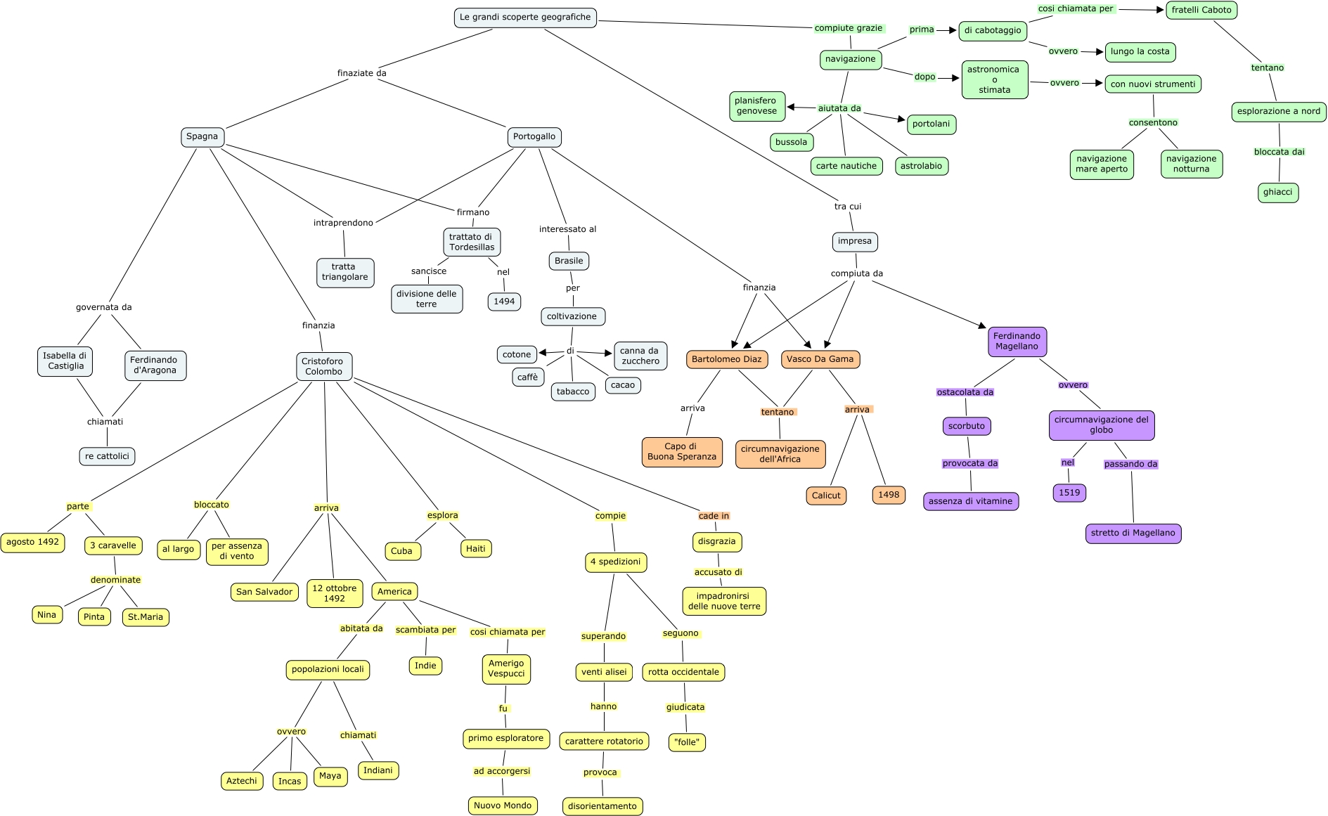 Questa Cmap, creata con IHMC CmapTools, contiene informazioni relative a: le grandi scoperte geografiche, America scambiata per Indie, coltivazione di caffè, Spagna governata da Isabella di Castiglia, coltivazione di canna da zucchero, Le grandi scoperte geografiche tra cui impresa, 3 caravelle denominate Nina, Portogallo intraprendono tratta triangolare, trattato di Tordesillas sancisce divisione delle terre, fratelli Caboto tentano esplorazione a nord, impresa compiuta da Vasco Da Gama, di cabotaggio cosi chiamata per fratelli Caboto, Portogallo firmano trattato di Tordesillas, popolazioni locali chiamati Indiani, impresa compiuta da Ferdinando Magellano, Bartolomeo Diaz tentano circumnavigazione dell'Africa, 4 spedizioni superando venti alisei, Spagna firmano trattato di Tordesillas, coltivazione di cacao, circumnavigazione del globo nel 1519, Vasco Da Gama arriva Calicut