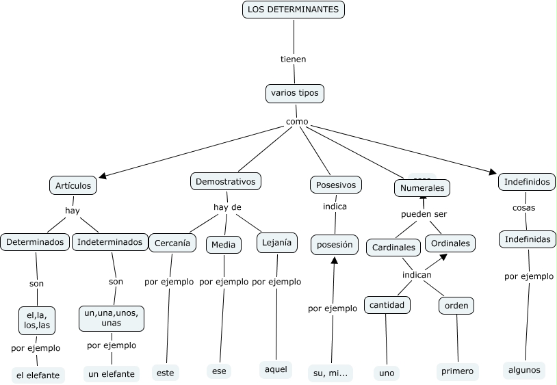Este Cmap, tiene información relacionada con: LOS DETERMINANTES(Lucas y Antonio), varios tipos como Artículos, Artículos hay Determinados, cantidad ???? uno, varios tipos como Numerales, Media por ejemplo ese, Posesivos indica posesión, Lejanía por ejemplo aquel, un,una,unos, unas por ejemplo un elefante, Numerales pueden ser Ordinales, Demostrativos hay de Lejanía, LOS DETERMINANTES tienen varios tipos, Indeterminados son un,una,unos, unas, Cardinales indican cantidad, orden ???? primero, Numerales pueden ser Cardinales, Cercanía por ejemplo este, varios tipos como Demostrativos, Indefinidas por ejemplo algunos, varios tipos como Posesivos, su, mi... por ejemplo posesión