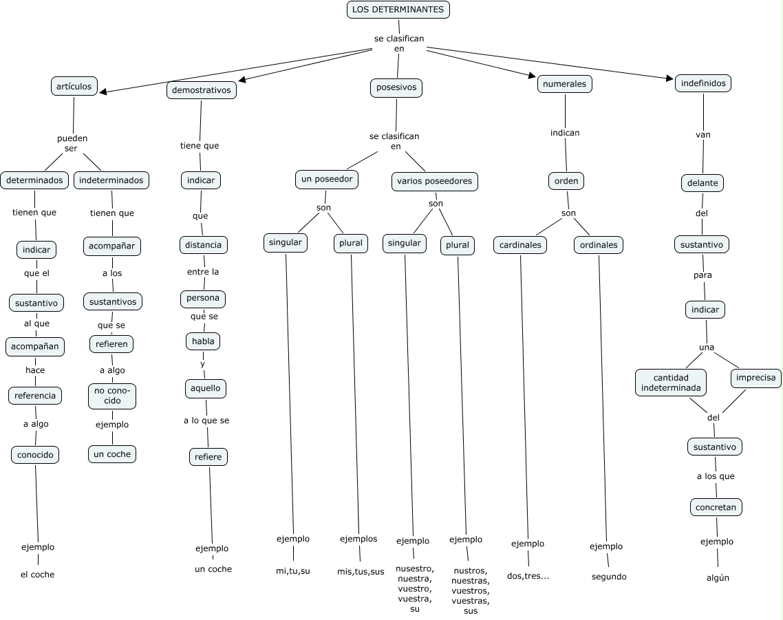 Este Cmap, tiene información relacionada con: Los DETERMINANTES (Martina y Germán), acompañar a los sustantivos, LOS DETERMINANTES se clasifican en artículos, delante del sustantivo, cardinales ejemplo dos,tres..., indicar que el sustantivo, un poseedor son plural, numerales indican orden, posesivos se clasifican en varios poseedores, plural ejemplo nustros, nuestras, vuestros, vuestras, sus, orden son cardinales, sustantivo al que acompañan, LOS DETERMINANTES se clasifican en indefinidos, LOS DETERMINANTES se clasifican en demostrativos, determinados tienen que indicar, refiere ejemplo un coche, imprecisa del sustantivo, demostrativos tiene que indicar, refieren a algo no cono- cido, acompañan hace referencia, persona que se habla