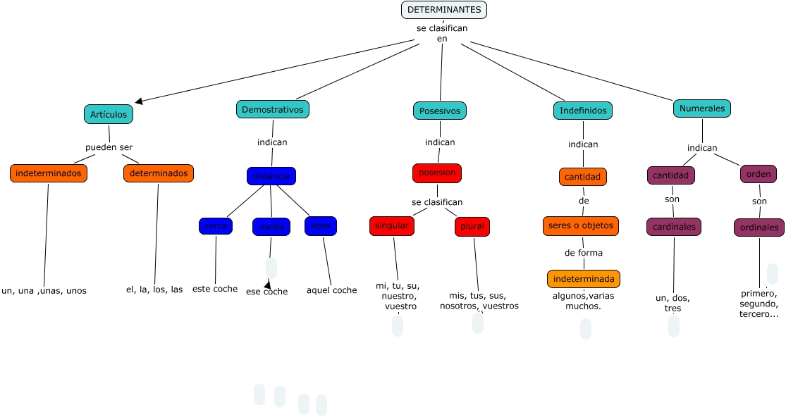 Este Cmap, tiene información relacionada con: LOS DETERMINANTES ( Carlos y Fernando ), DETERMINANTES se clasifican en Demostrativos, media ese coche, Artículos pueden ser determinados, plural mis, tus, sus, nosotros, vuestros, Demostrativos indican distancia, DETERMINANTES se clasifican en Artículos, cardinales un, dos, tres, Numerales se clasifican en Indefinidos, distancia ???? media, ordinales primero, segundo, tercero..., cerca este coche, cantidad de seres o objetos, posesion se clasifican plural, distancia ???? lejos, DETERMINANTES se clasifican en Indefinidos, posesion se clasifican singular, cantidad son cardinales, distancia ???? cerca, plural mis, tus, sus, nosotros, vuestros, Numerales se clasifican en Posesivos
