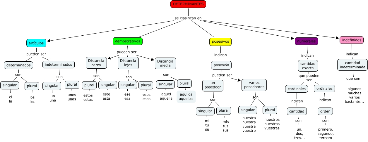 Este Cmap, tiene información relacionada con: Los DETERMINANTES (Moisés y Sandra), singular ???? ese esa, indefinidos indican cantidad indeterminada, posesivos indican posesión, artículos pueden ser determinados, posesión pueden ser un posedoor, indeterminados son singular, plural ???? aqullos aquellas, plural ???? los las, ordinales indican orden, plural ???? estos estas, plural ???? esos esas, orden son primero, segundo, tercero, Distancia lejos son plural, DETERMINANTES se clasifican en demostrativos, artículos pueden ser indeterminados, singular ???? mi tu su, varios posedoores son singular, Distancia media son plural, DETERMINANTES se clasifican en indefinidos, plural ???? mis tus sus