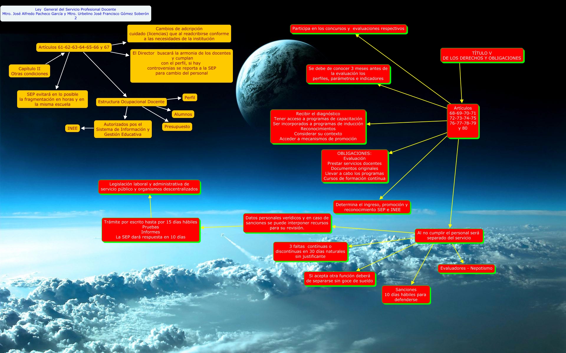 Este Cmap, tiene información relacionada con: Ley General del Servicio profesional Docente 2, Al no cumplir el personal será separado del servicio ???? Sanciones 10 días hábiles para defenderse, Datos personales verídicos y en caso de sanciones se puede interponer recursos para su revisión. ???? Trámite por escrito hasta por 15 días hábiles Pruebas Informes La SEP dará respuesta en 10 días, Artículos 68-69-70-71 72-73-74-75 76-77-78-79 y 80 ???? Al no cumplir el personal será separado del servicio, Artículos 61-62-63-64-65-66 y 67 ???? SEP evitará en lo posible la fragmentación en horas y en la misma escuela, Al no cumplir el personal será separado del servicio ???? Datos personales verídicos y en caso de sanciones se puede interponer recursos para su revisión., Capítulo II Otras condiciones ???? Artículos 61-62-63-64-65-66 y 67, Estructura Ocupacional Docente ???? Presupuesto, Artículos 61-62-63-64-65-66 y 67 ???? El Director buscará la armonia de los docentes y cumplan con el perfil, si hay controversias se reporta a la SEP para cambio del personal, Estructura Ocupacional Docente ???? Perfil, Artículos 68-69-70-71 72-73-74-75 76-77-78-79 y 80 ???? Participa en los concursos y evaluaciones respectivos, Artículos 68-69-70-71 72-73-74-75 76-77-78-79 y 80 ???? Se debe de conocer 3 meses antes de la evaluación los perfiles, parámetros e indicadores, Artículos 68-69-70-71 72-73-74-75 76-77-78-79 y 80 ???? Recibir el diagnóstico Tener acceso a programas de capacitación Ser incorporados a programas de inducción Reconocimientos Considerar su contexto Acceder a mecanismos de promoción, Al no cumplir el personal será separado del servicio ???? 3 faltas contínuas o discontínuas en 30 días naturales sin justificante, Al no cumplir el personal será separado del servicio ???? Si acepta otra función deberá de separarse sin goce de sueldo, Artículos 68-69-70-71 72-73-74-75 76-77-78-79 y 80 ???? OBLIGACIONES: Evaluación Prestar servicios docentes Documentos originales Llevar a cabo los programas Cursos de formación contínua, Artículos 68-69-70-71 72-73-74-75 76-77-78-79 y 80 ???? Determina el ingreso, promoción y reconocimiento SEP e INEE, Estructura Ocupacional Docente ???? Autorizados pos el Sistema de Información y Gestión Educativa, Trámite por escrito hasta por 15 días hábiles Pruebas Informes La SEP dará respuesta en 10 días ???? Legislación laboral y administrativa de servicio público y organismos descentralizados, Autorizados pos el Sistema de Información y Gestión Educativa ???? INEE, TÍTULO V DE LOS DERECHOS Y OBLIGACIONES ???? Artículos 68-69-70-71 72-73-74-75 76-77-78-79 y 80