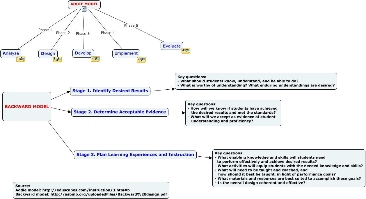 This Concept Map, created with IHMC CmapTools, has information related to: ADDIE and Backward model, Stage 2. Determine Acceptable Evidence ???? Key questions: - How will we know if students have achieved the desired results and met the standards? - What will we accept as evidence of student understanding and proficiency?, ADDIE MODEL Phase 3 Develop, BACKWARD MODEL ???? Stage 3. Plan Learning Experiences and Instruction, Stage 1. Identify Desired Results ???? Key questions: - What should students know, understand, and be able to do? - What is worthy of understanding? What enduring understandings are desired?, ADDIE MODEL Phase 4 Implement, ADDIE MODEL Phase 5 Evaluate, Stage 3. Plan Learning Experiences and Instruction ???? Key questions: - What enabling knowledge and skills will students need to perform effectively and achieve desired results? - What activities will equip students with the needed knowledge and skills? - What will need to be taught and coached, and how should it best be taught, in light of performance goals? - What materials and resources are best suited to accomplish these goals? - Is the overall design coherent and effective?, ADDIE MODEL Phase 1 Analyze, ADDIE MODEL Phase 2 Design, BACKWARD MODEL ???? Stage 2. Determine Acceptable Evidence, BACKWARD MODEL ???? Stage 1. Identify Desired Results