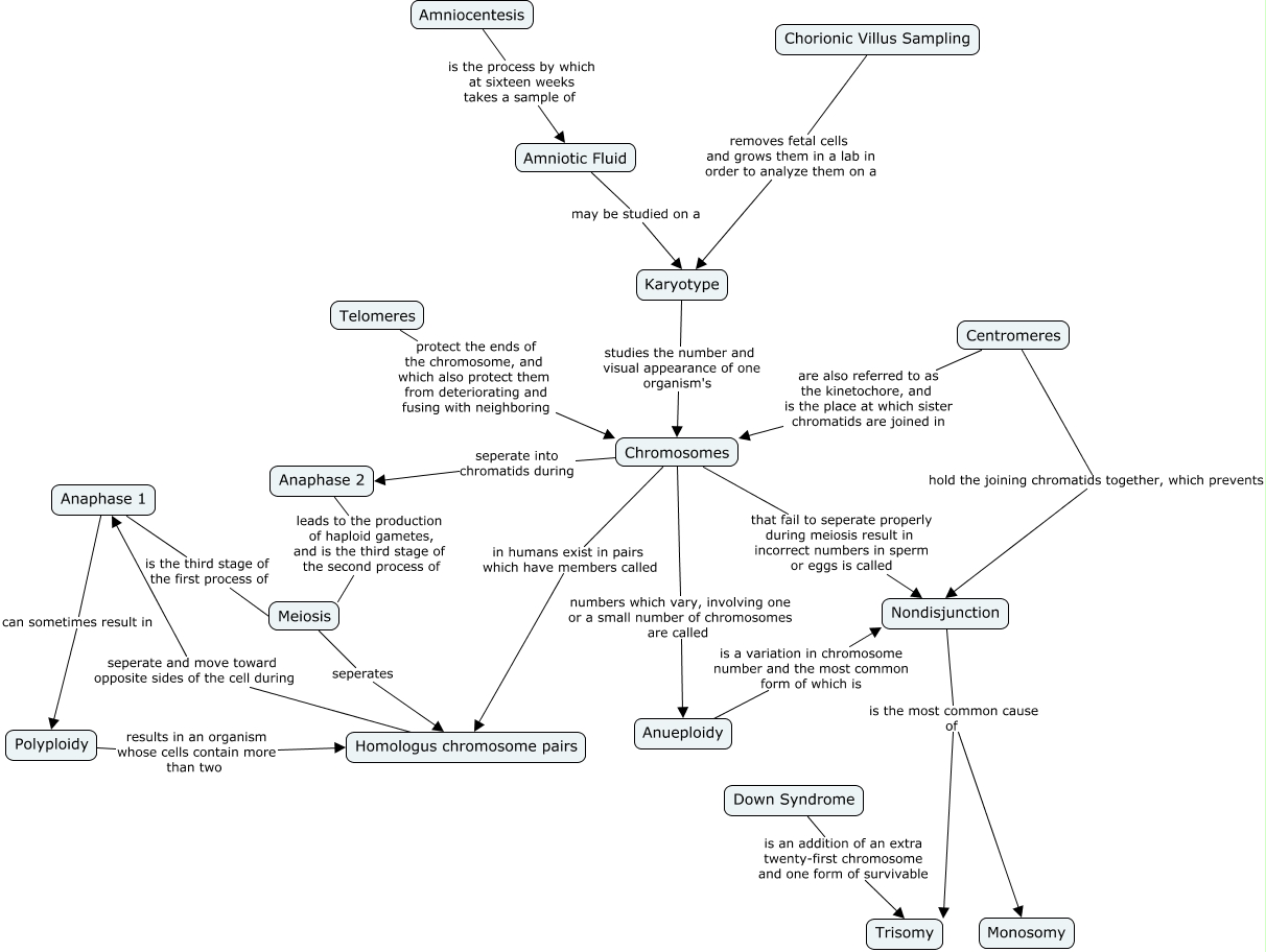 This Concept Map, created with IHMC CmapTools, has information related to: Group 4 Mini map 2, Centromeres are also referred to as the kinetochore, and is the place at which sister chromatids are joined in Chromosomes, Telomeres protect the ends of the chromosome, and which also protect them from deteriorating and fusing with neighboring Chromosomes, Polyploidy results in an organism whose cells contain more than two Homologus chromosome pairs, Meiosis seperates Homologus chromosome pairs, Chorionic Villus Sampling removes fetal cells and grows them in a lab in order to analyze them on a Karyotype, Chromosomes that fail to seperate properly during meiosis result in incorrect numbers in sperm or eggs is called Nondisjunction, Karyotype studies the number and visual appearance of one organism's Chromosomes, Amniotic Fluid may be studied on a Karyotype, Nondisjunction is the most common cause of Trisomy, Nondisjunction is the most common cause of Monosomy, Anueploidy is a variation in chromosome number and the most common form of which is Nondisjunction, Anaphase 1 can sometimes result in Polyploidy, Homologus chromosome pairs seperate and move toward opposite sides of the cell during Anaphase 1, Down Syndrome is an addition of an extra twenty-first chromosome and one form of survivable Trisomy, Chromosomes seperate into chromatids during Anaphase 2, Anaphase 2 leads to the production of haploid gametes, and is the third stage of the second process of Meiosis, Anaphase 1 is the third stage of the first process of Meiosis, Amniocentesis is the process by which at sixteen weeks takes a sample of Amniotic Fluid, Centromeres hold the joining chromatids together, which prevents Nondisjunction, Chromosomes numbers which vary, involving one or a small number of chromosomes are called Anueploidy