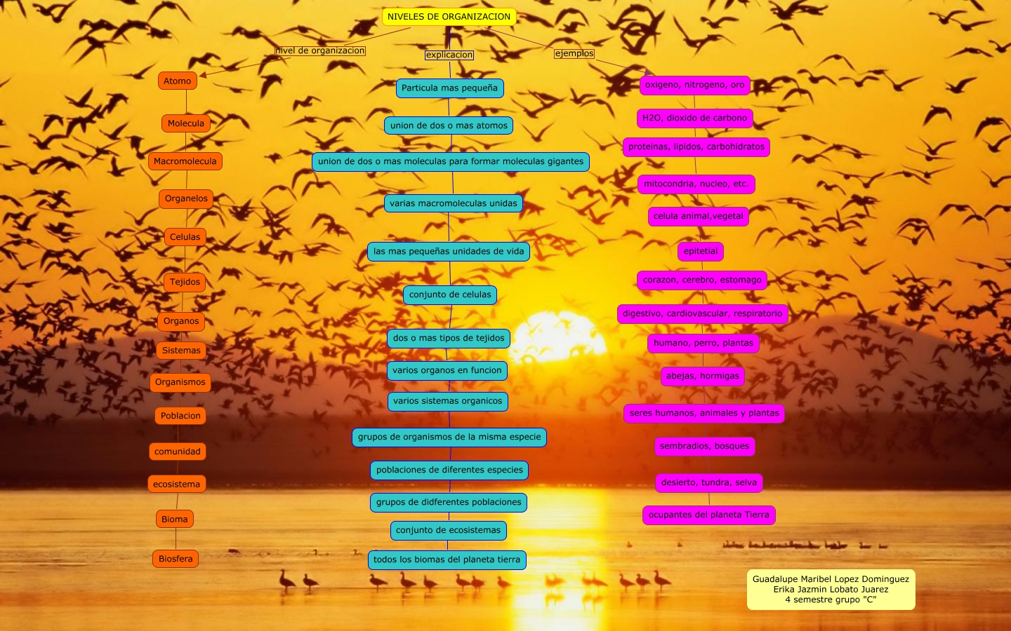 Este Cmap, tiene información relacionada con: erika y guadalupe, desierto, tundra, selva ???? ocupantes del planeta Tierra, Poblacion ???? comunidad, NIVELES DE ORGANIZACION nivel de organizacion Atomo, las mas pequeñas unidades de vida ???? conjunto de celulas, conjunto de celulas ???? dos o mas tipos de tejidos, Celulas ???? Tejidos, comunidad ???? ecosistema, conjunto de ecosistemas ???? todos los biomas del planeta tierra, digestivo, cardiovascular, respiratorio ???? humano, perro, plantas, ecosistema ???? Bioma, las mas pequeñas unidades de vida ???? varias macromoleculas unidas, abejas, hormigas ???? seres humanos, animales y plantas, Organos ???? Sistemas, union de dos o mas atomos ???? union de dos o mas moleculas para formar moleculas gigantes, Tejidos ???? Organos, Bioma ???? Biosfera, sembradios, bosques ???? desierto, tundra, selva, Organelos ???? Celulas, Molecula ???? Macromolecula, humano, perro, plantas ???? abejas, hormigas