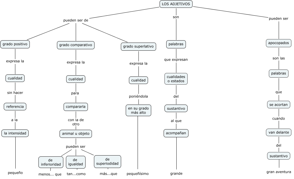 Este Cmap, tiene información relacionada con: ADJETIVOS-(Andrés y Joshua), palabras que se acortan, referencia a la la intensidad, sustantivo ???? gran aventura, animal u objeto pueden ser de igualdad, animal u objeto pueden ser de inferioridad, cualidades o estados del sustantivo, apocopados son las palabras, grado positivo pueden ser de grado comparativo, grado superlativo expresa la cualidad, de igualdad ???? tan...como, grado comparativo expresa la cualidad, compararla con la de otro animal u objeto, cualidad para compararla, acompañan ???? grande, de superiodidad ???? más...que, la intensidad ???? pequeño, cualidad poniéndola en su grado más alto, LOS ADJETIVOS son palabras, grado positivo pueden ser de grado superlativo, en su grado más alto ???? pequeñísimo