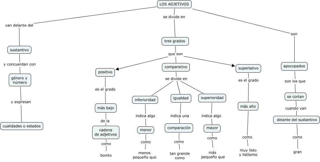 Este Cmap, tiene información relacionada con: LOS ADJETIVOS-(Borja y Ángel), se cortan cuando van delante del sustantivo, comparativo se divide en inferioridad, mayor como más pequeño que, comparativo se divide en superioridad, tres grados que son comparativo, positivo es el grado más bajo, sustantivo y concuerdan con género y número, comparativo se divide en igualdad, comparación como tan grande como, LOS ADJETIVOS se divide en tres grados, inferioridad indica algo menor, superioridad indica algo mayor, tres grados que son superlativo, cadena de adjetivos como bonito, más bajo de la cadena de adjetivos, LOS ADJETIVOS van delante del sustantivo, menor como menos pequeño que, apocopados son los que se cortan, más alto como muy listo y listísimo, tres grados que son positivo