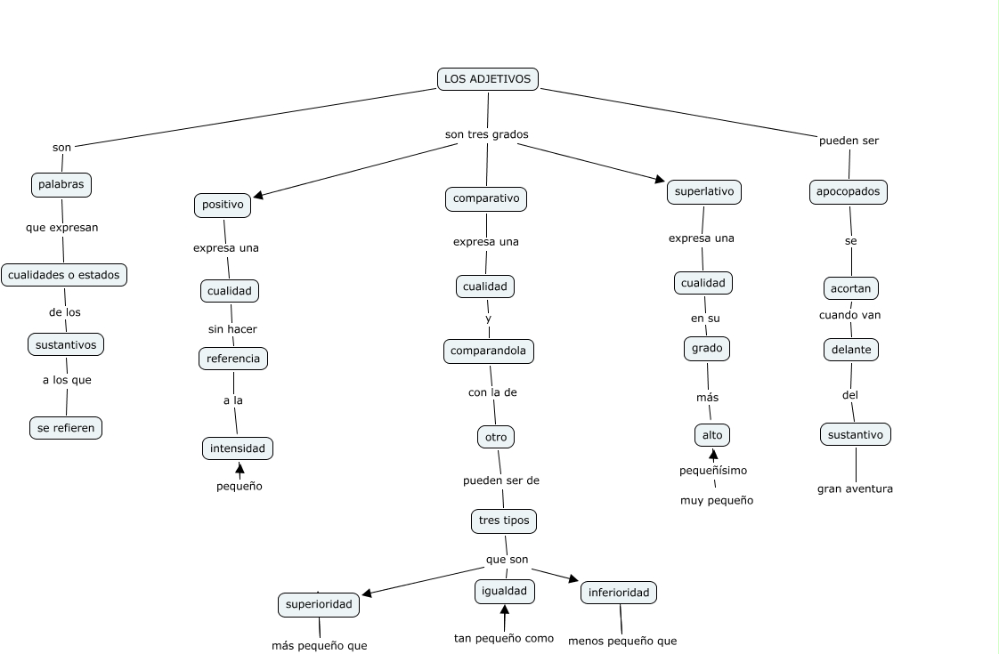 Este Cmap, tiene información relacionada con: LOS ADJETIVOS-De Lucas y Antonio, otro pueden ser de tres tipos, alto pequeñísimo muy pequeño, sustantivo gran aventura, superioridad más pequeño que, tres tipos que son superioridad, intensidad pequeño, LOS ADJETIVOS pueden ser apocopados, LOS ADJETIVOS son palabras, cualidad y comparandola, LOS ADJETIVOS son tres grados comparativo, grado más alto, delante del sustantivo, tres tipos que son igualdad, alto pequeñísimo muy pequeño, referencia a la intensidad, LOS ADJETIVOS son tres grados superlativo, LOS ADJETIVOS son tres grados positivo, alto pequeñísimo, tres tipos que son inferioridad, igualdad tan pequeño como ????