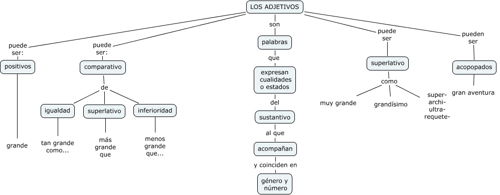 Este Cmap, tiene información relacionada con: ADJETIVOS-(María y Lula), superlativo como super- archi- ultra- requete-, sustantivo al que acompañan, LOS ADJETIVOS puede ser superlativo, LOS ADJETIVOS puede ser: comparativo, comparativo de igualdad, positivos como grande, superlativo como muy grande, LOS ADJETIVOS pueden ser acopopados, palabras que expresan cualidades o estados, LOS ADJETIVOS puede ser: positivos, inferioridad ???? menos grande que..., acopopados ???? gran aventura, comparativo de inferioridad, superlativo ???? más grande que, expresan cualidades o estados del sustantivo, superlativo como grandísimo, acompañan y coinciden en género y número, LOS ADJETIVOS son palabras, comparativo de superlativo, igualdad ???? tan grande como...
