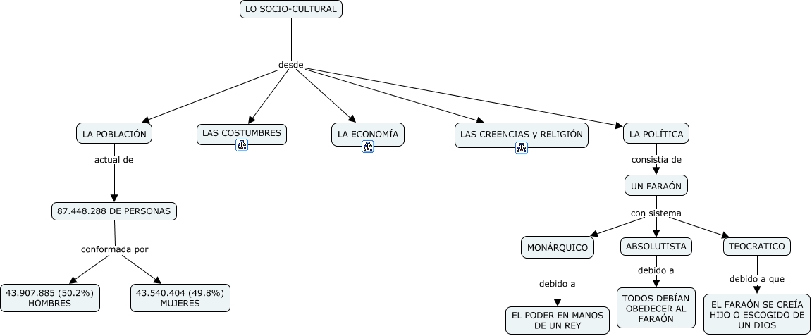 Este Cmap, tiene información relacionada con: SOCIO-CULTURAL, TEOCRATICO debido a que EL FARAÓN SE CREÍA HIJO O ESCOGIDO DE UN DIOS, LO SOCIO-CULTURAL desde LA ECONOMÍA, LO SOCIO-CULTURAL desde LAS CREENCIAS y RELIGIÓN, LO SOCIO-CULTURAL desde LA POBLACIÓN, ABSOLUTISTA debido a TODOS DEBÍAN OBEDECER AL FARAÓN, LA POLÍTICA consistía de UN FARAÓN, MONÁRQUICO debido a EL PODER EN MANOS DE UN REY, LA POBLACIÓN actual de 87.448.288 DE PERSONAS, 87.448.288 DE PERSONAS conformada por 43.540.404 (49.8%) MUJERES, 87.448.288 DE PERSONAS conformada por 43.907.885 (50.2%) HOMBRES, LO SOCIO-CULTURAL desde LA POLÍTICA, LO SOCIO-CULTURAL desde LAS COSTUMBRES, UN FARAÓN con sistema MONÁRQUICO, UN FARAÓN con sistema ABSOLUTISTA, UN FARAÓN con sistema TEOCRATICO