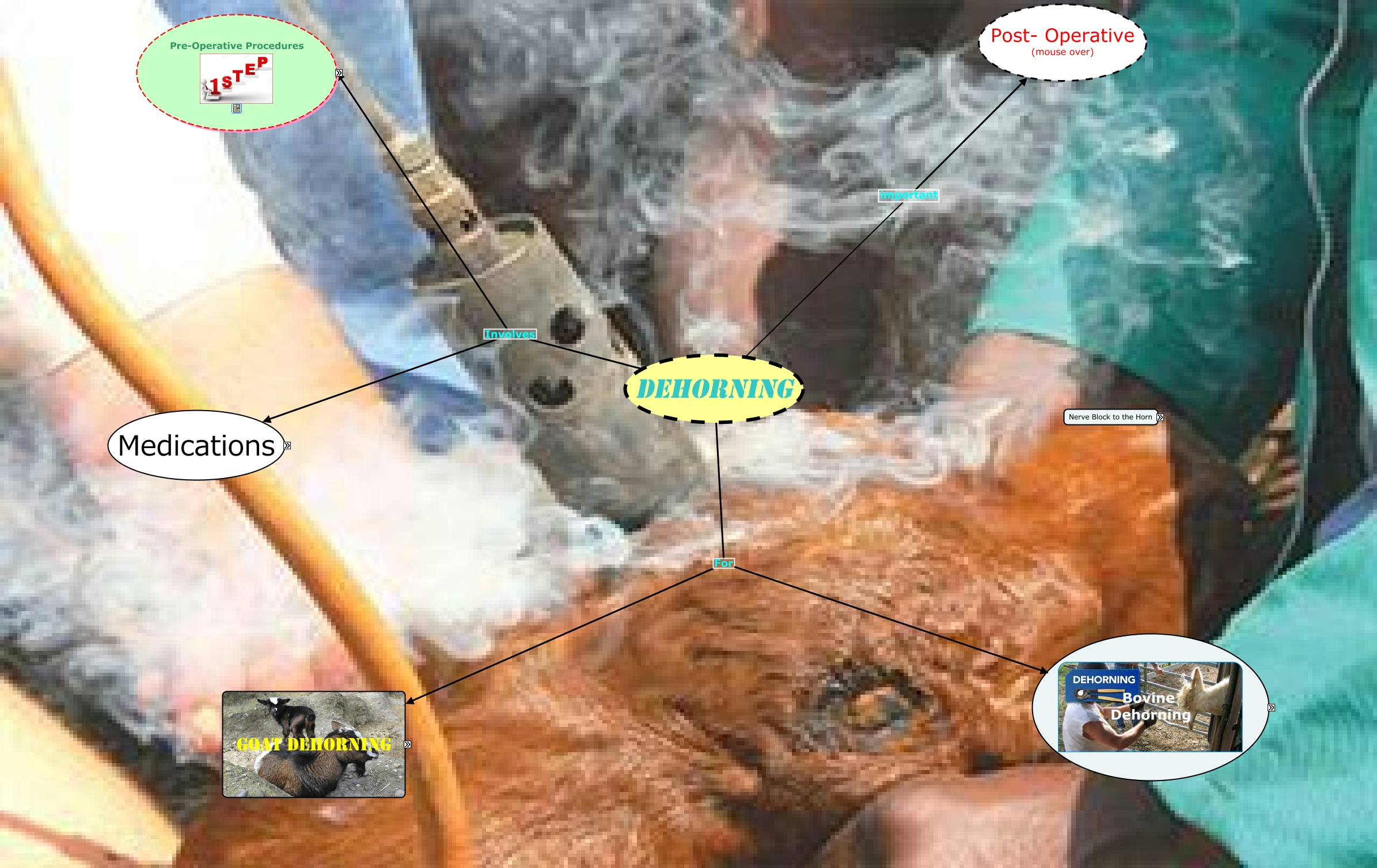 This Concept Map, created with IHMC CmapTools, has information related to: Dehorning Final, Antibiotics include Injectable, Goat Dehorning includes Reasons (mouse over), Pen-Strep Dose Rate : 20,000 IU/kg note that Contraindications: known cases of hypersensitivity to penicillins transient pyrexia, vomiting, shivering, listlessnes, incoordination, vulval discharge and abortion in pigs, Nerve Block to the Horn include Technique for Administration of Lidocaine, Mechanical Methods of Dehorning decide instrument to use by Age, Advantages and Disadvantages Disadvantages include These, Xylazine Dosage: 0.05mg/kg note that Contraindications/side effects:/ Considerations: Do not use on goats with urethral obstruction Reduces Ruminal activity and cardiac sphincter tone Reduced swallowing and laryngeal activity Pulmonary Oedema (esp in sheep), Dehorning Spoons And Tubes includes Procedure, gigli wire includes Considerations (mouse over), Post- operative for the Vet (mouse over), Considerations Post-Operative Ensure that the jaws of the Dehorner is CLEANED and DISINFECTED between calves, Goat Dehorning includes Contraindications (mouse over), Scoop/Gouge/Barnes-Type Dehorner includes Considerations, Considerations Intra-Operative Heat can transfer through the thin bones of the skull and damage the calf's brain. (mouse over), Physical Use Halter, Advantages and Disadvantages Disadvantages painful, complications includes Infection/Sinusitis (mouse over), Normal Parameters Range Temperature 100.5-102.5 °F, Considerations Post-Operative Risk of infection because of open wounds, Goat Dehorning includes Instruments