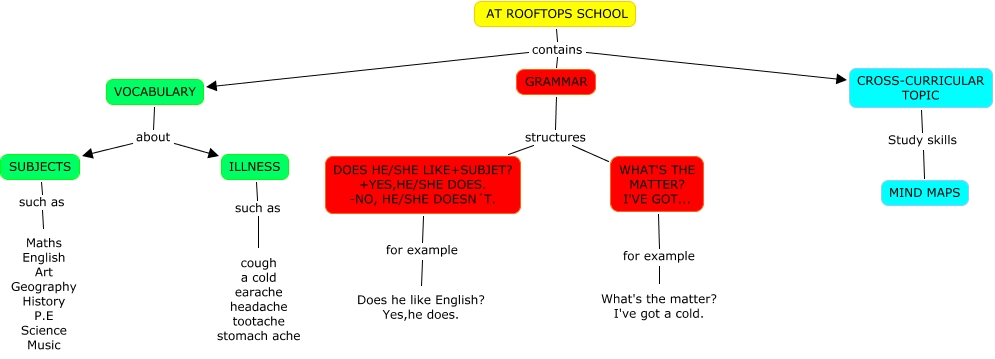 Este Cmap, tiene información relacionada con: AT ROOFTOPS SCHOOL-MARCOS E IRENE, WHAT'S THE MATTER? I'VE GOT... for example What's the matter? I've got a cold., AT ROOFTOPS SCHOOL contains VOCABULARY, GRAMMAR structures DOES HE/SHE LIKE+SUBJET? +YES,HE/SHE DOES. -NO, HE/SHE DOESN´T., CROSS-CURRICULAR TOPIC Study skills MIND MAPS, SUBJECTS such as Maths English Art Geography History P.E Science Music, AT ROOFTOPS SCHOOL contains GRAMMAR, AT ROOFTOPS SCHOOL contains CROSS-CURRICULAR TOPIC, VOCABULARY about SUBJECTS, DOES HE/SHE LIKE+SUBJET? +YES,HE/SHE DOES. -NO, HE/SHE DOESN´T. for example Does he like English? Yes,he does., ILLNESS such as cough a cold earache headache tootache stomach ache, GRAMMAR structures WHAT'S THE MATTER? I'VE GOT..., VOCABULARY about ILLNESS