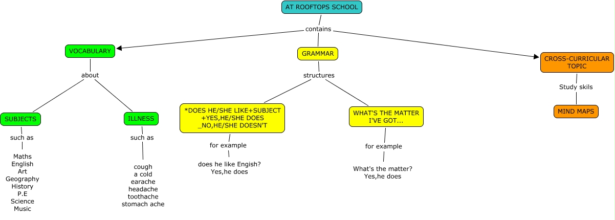 Este Cmap, tiene información relacionada con: AT ROOFTOPS SCHOOL- Carmen, CROSS-CURRICULAR TOPIC Study skils MIND MAPS, GRAMMAR structures WHAT'S THE MATTER I'VE GOT..., VOCABULARY about SUBJECTS, AT ROOFTOPS SCHOOL contains CROSS-CURRICULAR TOPIC, WHAT'S THE MATTER I'VE GOT... for example What's the matter? Yes,he does, *DOES HE/SHE LIKE+SUBJECT +YES,HE/SHE DOES _NO,HE/SHE DOESN'T for example does he like Engish? Yes,he does, ILLNESS such as cough a cold earache headache toothache stomach ache, GRAMMAR structures *DOES HE/SHE LIKE+SUBJECT +YES,HE/SHE DOES _NO,HE/SHE DOESN'T, SUBJECTS such as Maths English Art Geography History P.E Science Music, VOCABULARY about ILLNESS, AT ROOFTOPS SCHOOL contains VOCABULARY, AT ROOFTOPS SCHOOL contains GRAMMAR