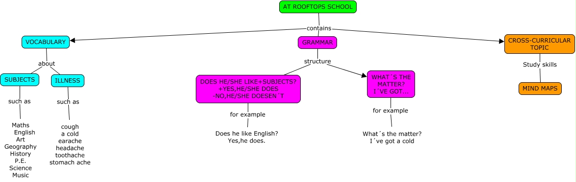 Este Cmap, tiene información relacionada con: AT ROOFTOPS SCHOOL Amira, AT ROOFTOPS SCHOOL contains VOCABULARY, ILLNESS such as cough a cold earache headache toothache stomach ache, WHAT´S THE MATTER? I´VE GOT... for example What´s the matter? I´ve got a cold, AT ROOFTOPS SCHOOL contains CROSS-CURRICULAR TOPIC, SUBJECTS such as Maths English Art Geography History P.E. Science Music, CROSS-CURRICULAR TOPIC Study skills MIND MAPS, AT ROOFTOPS SCHOOL contains GRAMMAR, DOES HE/SHE LIKE+SUBJECTS? +YES,HE/SHE DOES -NO,HE/SHE DOESEN´T for example Does he like English? Yes,he does., GRAMMAR structure DOES HE/SHE LIKE+SUBJECTS? +YES,HE/SHE DOES -NO,HE/SHE DOESEN´T, VOCABULARY about SUBJECTS, GRAMMAR structure WHAT´S THE MATTER? I´VE GOT..., VOCABULARY about ILLNESS