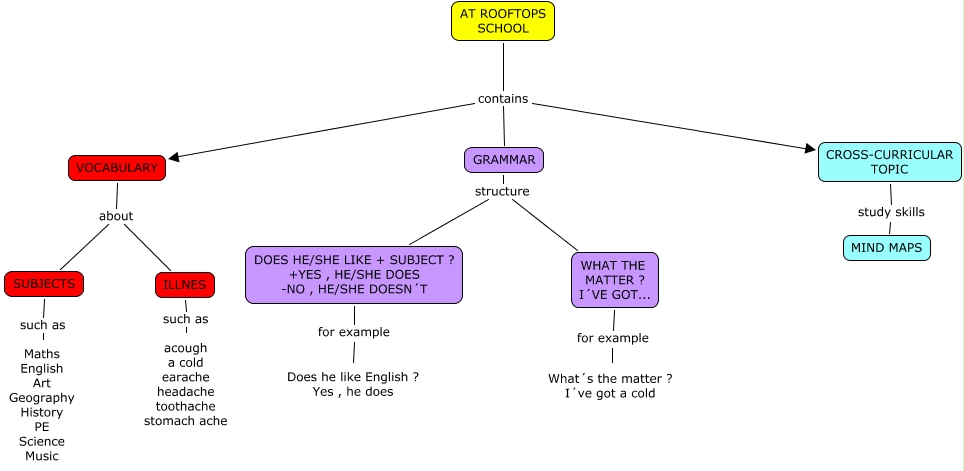 Este Cmap, tiene información relacionada con: AT ROOFTOPS SCHOOL-Santiago, ILLNES such as acough a cold earache headache toothache stomach ache, SUBJECTS such as Maths English Art Geography History PE Science Music, VOCABULARY about SUBJECTS, GRAMMAR structure WHAT THE MATTER ? I´VE GOT..., AT ROOFTOPS SCHOOL contains GRAMMAR, WHAT THE MATTER ? I´VE GOT... for example What´s the matter ? I´ve got a cold, AT ROOFTOPS SCHOOL contains VOCABULARY, GRAMMAR structure DOES HE/SHE LIKE + SUBJECT ? +YES , HE/SHE DOES -NO , HE/SHE DOESN´T, DOES HE/SHE LIKE + SUBJECT ? +YES , HE/SHE DOES -NO , HE/SHE DOESN´T for example Does he like English ? Yes , he does, AT ROOFTOPS SCHOOL contains CROSS-CURRICULAR TOPIC, CROSS-CURRICULAR TOPIC study skills MIND MAPS, VOCABULARY about ILLNES