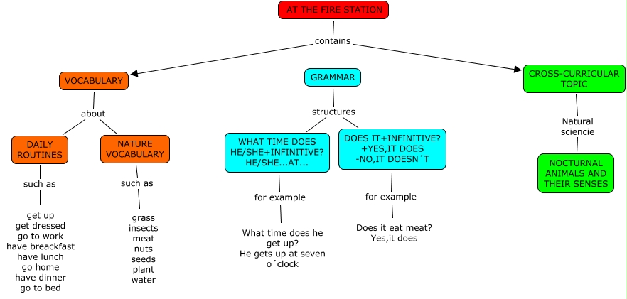 Este Cmap, tiene información relacionada con: AT THE FIRE STATION-Gabriel, NATURE VOCABULARY such as grass insects meat nuts seeds plant water, AT THE FIRE STATION contains GRAMMAR, GRAMMAR structures WHAT TIME DOES HE/SHE+INFINITIVE? HE/SHE...AT..., GRAMMAR structures DOES IT+INFINITIVE? +YES,IT DOES -NO,IT DOESN´T, CROSS-CURRICULAR TOPIC Natural sciencie NOCTURNAL ANIMALS AND THEIR SENSES, DAILY ROUTINES such as get up get dressed go to work have breackfast have lunch go home have dinner go to bed, VOCABULARY about DAILY ROUTINES, AT THE FIRE STATION contains CROSS-CURRICULAR TOPIC, WHAT TIME DOES HE/SHE+INFINITIVE? HE/SHE...AT... for example What time does he get up? He gets up at seven o´clock, AT THE FIRE STATION contains VOCABULARY, VOCABULARY about NATURE VOCABULARY, DOES IT+INFINITIVE? +YES,IT DOES -NO,IT DOESN´T for example Does it eat meat? Yes,it does
