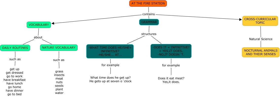 Este Cmap, tiene información relacionada con: AT THE FIRE STATION-Irene, AT THE FIRE STATION contains GRAMMAR, NATURE VOCABULARY such as grass insects meat nuts seeds plant water, -DOES IT + INFINITIVE? + YES,IT DOES. -NO,IT DOESN´T. for example Does it eat meat? Yes,it does., AT THE FIRE STATION contains VOCABULARY, GRAMMAR structures -WHAT TIME DOES HE/SHE+ INFINITIVE? -HE/SHE... AT..., DAILY ROUTINES such as get up get dressed go to work have breakfast have lunch go home have dinner go to bed, VOCABULARY about NATURE VOCABULARY, -WHAT TIME DOES HE/SHE+ INFINITIVE? -HE/SHE... AT... for example What time does he get up? He gets up at seven o´clock, CROSS-CURRICULAR TOPIC Natural Science NOCTURNAL ANIMALS AND THEIR SENSES, VOCABULARY about DAILY ROUTINES, GRAMMAR structures -DOES IT + INFINITIVE? + YES,IT DOES. -NO,IT DOESN´T., AT THE FIRE STATION contains CROSS-CURRICULAR TOPIC