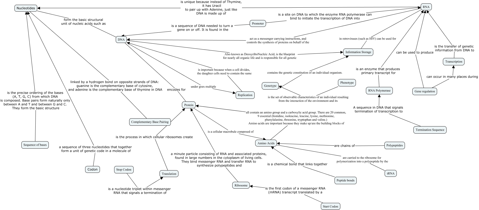 This Concept Map, created with IHMC CmapTools, has information related to: Deoxys Derivatives CMap, Start Codon is the first codon of a messenger RNA (mRNA) transcript translated by a Ribosome, Termination Sequence A sequence in DNA that signals termination of transcription to RNA Polymerase, Replication is important because when a cell divides, the daughter cells need to contain the same DNA, DNA encodes for Protein, Peptide bonds is a chemical bond that links together Amino Acids, Amino Acids all contain an amino group and a carboxylic acid group. There are 20 common, 9 essential (histidine, isoleucine, leucine, lysine, methionine, phenylalanine, threonine, tryptophan and valine.) Amino acids are important because they make up/are the building blocks of Protein, RNA Polymerase is an enzyme that produces primary transcript for RNA, Genotype contains the genetic constitution of an individual organism. Information Storage, DNA Also known as DeoxyriboNucleic Acid, is the blueprint for nearly all organic life and is responsible for all genetic Information Storage, Protein is a cellular macrobule composed of Amino Acids, Gene regulation can occur in many places during Transcription, Sequence of bases is the precise ordering of the bases (A, T, G, C) from which DNA is composed. Base pairs form naturally only between A and T and between G and C. They form the basic structure Nucleotides, DNA under goes multiple Replication, Nucleotides linked by a hydrogen bond on opposite strands of DNA: guanine is the complementary base of cytosine, and adenine is the complementary base of thymine in DNA Complementary Base Pairing, Nucleotides form the basic structural unit of nucleic acids such as DNA, Codon a sequence of three nucleotides that together form a unit of genetic code in a molecule of Nucleotides, RNA in retroviruses (such as HIV) can be used for Information Storage, Ribosome a minute particle consisting of RNA and associated proteins, found in large numbers in the cytoplasm of living cells. They bind messenger RNA and transfer RNA to synthesize polypeptides and Protein, RNA act as a messenger carrying instructions, and controls the synthesis of proteins on behalf of the DNA, Promoter is a sequence of DNA needed to turn a gene on or off. It is found in the DNA