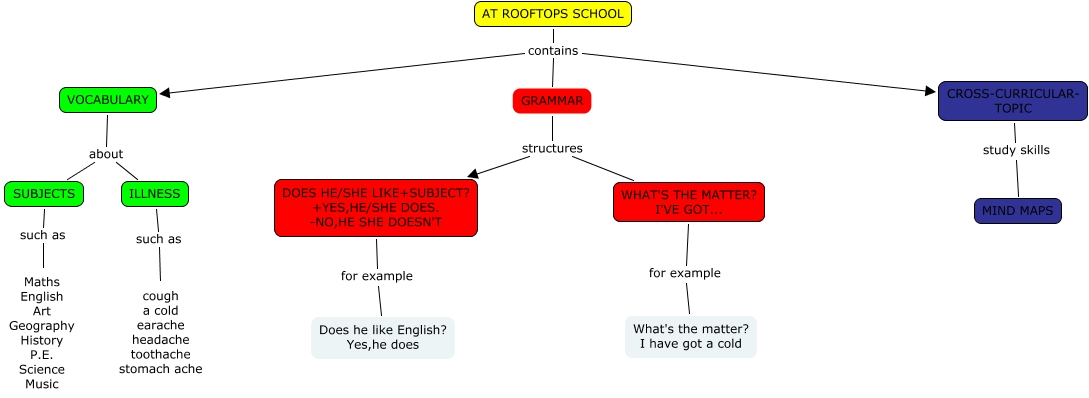Este Cmap, tiene información relacionada con: AT ROOFTOPS SCHOOL- Yago, AT ROOFTOPS SCHOOL contains CROSS-CURRICULAR- TOPIC, VOCABULARY about SUBJECTS, DOES HE/SHE LIKE+SUBJECT? +YES,HE/SHE DOES. -NO,HE SHE DOESN'T for example Does he like English? Yes,he does, SUBJECTS such as Maths English Art Geography History P.E. Science Music, AT ROOFTOPS SCHOOL contains VOCABULARY, ILLNESS such as cough a cold earache headache toothache stomach ache, AT ROOFTOPS SCHOOL contains GRAMMAR, VOCABULARY about ILLNESS, GRAMMAR structures WHAT'S THE MATTER? I'VE GOT..., WHAT'S THE MATTER? I'VE GOT... for example What's the matter? I have got a cold, GRAMMAR structures DOES HE/SHE LIKE+SUBJECT? +YES,HE/SHE DOES. -NO,HE SHE DOESN'T, CROSS-CURRICULAR- TOPIC study skills MIND MAPS
