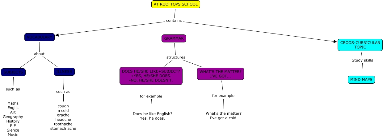 Este Cmap, tiene información relacionada con: AT ROOFTOPS SCHOOL-Lidia y Sofía, SUBJECTS such as Maths Englis Art Geography History P.E Sience Music, AT ROOFTOPS SCHOOL contains GRAMMAR, WHAT'S THE MATTER? I'VE GOT... for example What's the matter? I've got a cold., CROOS-CURRICULAR TOPIC Study skills MIND MAPS, ILLNESS such as cough a cold erache headche toothache stomach ache, GRAMMAR structures WHAT'S THE MATTER? I'VE GOT..., DOES HE/SHE LIKE+SUBJECT? +YES, HE/SHE DOES. -NO, HE/SHE DOESN'T. for example Does he like English? Yes, he does., GRAMMAR structures DOES HE/SHE LIKE+SUBJECT? +YES, HE/SHE DOES. -NO, HE/SHE DOESN'T., AT ROOFTOPS SCHOOL contains VOCABULARY, VOCABULARY about SUBJECTS, AT ROOFTOPS SCHOOL contains CROOS-CURRICULAR TOPIC, ILLNESS about SUBJECTS