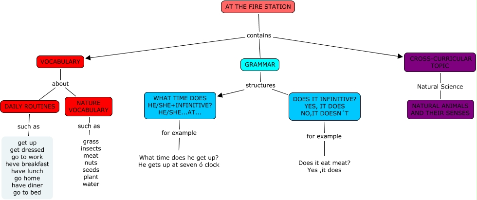 Este Cmap, tiene información relacionada con: AT THE FIRE STATION-Alejandra, NATURE VOCABULARY such as grass insects meat nuts seeds plant water, AT THE FIRE STATION contains GRAMMAR, AT THE FIRE STATION contains CROSS-CURRICULAR TOPIC, DOES IT INFINITIVE? YES, IT DOES NO,IT DOESN´T structures WHAT TIME DOES HE/SHE+INFINITIVE? HE/SHE...AT..., CROSS-CURRICULAR TOPIC Natural Science NATURAL ANIMALS AND THEIR SENSES, DOES IT INFINITIVE? YES, IT DOES NO,IT DOESN´T for example Does it eat meat? Yes ,it does, AT THE FIRE STATION contains VOCABULARY, VOCABULARY about DAILY ROUTINES, GRAMMAR structures WHAT TIME DOES HE/SHE+INFINITIVE? HE/SHE...AT..., VOCABULARY about NATURE VOCABULARY, DAILY ROUTINES such as get up get dressed go to work heve breakfast have lunch go home have diner go to bed, WHAT TIME DOES HE/SHE+INFINITIVE? HE/SHE...AT... for example What time does he get up? He gets up at seven ó clock