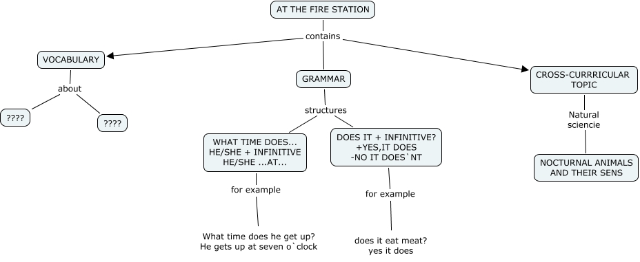 Este Cmap, tiene información relacionada con: AT THE FIRE STATION-JAIME ALEX, DOES IT + INFINITIVE? +YES,IT DOES -NO IT DOES`NT for example does it eat meat? yes it does, AT THE FIRE STATION contains VOCABULARY, AT THE FIRE STATION contains CROSS-CURRRICULAR TOPIC, GRAMMAR structures WHAT TIME DOES... HE/SHE + INFINITIVE HE/SHE ...AT..., VOCABULARY about ????, GRAMMAR structures DOES IT + INFINITIVE? +YES,IT DOES -NO IT DOES`NT, VOCABULARY about ????, AT THE FIRE STATION contains GRAMMAR, CROSS-CURRRICULAR TOPIC Natural sciencie NOCTURNAL ANIMALS AND THEIR SENS, WHAT TIME DOES... HE/SHE + INFINITIVE HE/SHE ...AT... for example What time does he get up? He gets up at seven o`clock