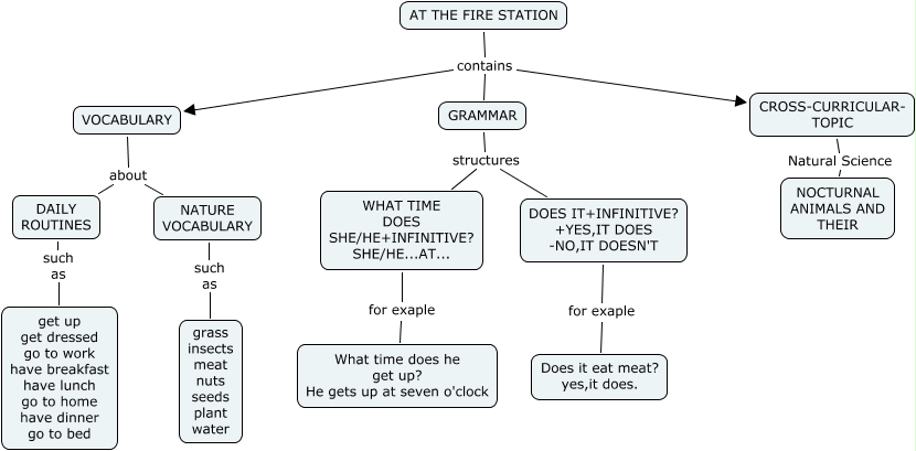Este Cmap, tiene información relacionada con: AT THE FIRE STATION -Daniela, GRAMMAR structures DOES IT+INFINITIVE? +YES,IT DOES -NO,IT DOESN'T, NATURE VOCABULARY such as grass insects meat nuts seeds plant water, AT THE FIRE STATION contains CROSS-CURRICULAR- TOPIC, CROSS-CURRICULAR- TOPIC Natural Science NOCTURNAL ANIMALS AND THEIR, DOES IT+INFINITIVE? +YES,IT DOES -NO,IT DOESN'T for exaple Does it eat meat? yes,it does., GRAMMAR structures WHAT TIME DOES SHE/HE+INFINITIVE? SHE/HE...AT..., DAILY ROUTINES such as get up get dressed go to work have breakfast have lunch go to home have dinner go to bed, VOCABULARY about DAILY ROUTINES, AT THE FIRE STATION contains VOCABULARY, WHAT TIME DOES SHE/HE+INFINITIVE? SHE/HE...AT... for exaple What time does he get up? He gets up at seven o'clock, VOCABULARY about NATURE VOCABULARY, AT THE FIRE STATION contains GRAMMAR