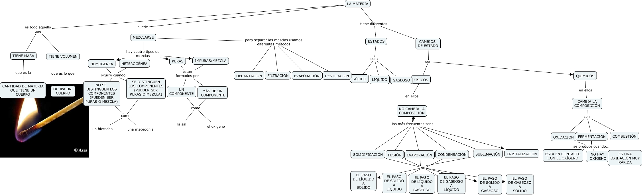 Este Cmap, tiene información relacionada con: LA MATERIA-Hugo C, SOLIDIFICACIÓN es EL PASO DE GASEOSO A SÓLIDO, LA MATERIA tiene diferentes CAMBIOS DE ESTADO, MEZCLARSE para separar las mezclas usamos diferentes métodos FILTRACIÓN, NO CAMBIA LA COMPOSICIÓN los más frecuentes son; CONDENSACIÓN, SUBLIMACIÓN es EL PASO DE GASEOSO A SÓLIDO, HETEROGÉNEA ocurre cuando NO SE DISTINGUEN LOS COMPONENTES (PUEDEN SER PURAS O MEZCLA), CAMBIOS DE ESTADO son QUÍMICOS, IMPURAS/MEZCLA estan formados por UN COMPONENTE, ESTADOS son: LÍQUIDO, COMBUSTIÓN ???? ES UNA OXIDACIÓN MUY RÁPIDA, HOMOGÉNEA ocurre cuando SE DISTINGUEN LOS COMPONENTES (PUEDEN SER PURAS O MEZCLA), NO CAMBIA LA COMPOSICIÓN los más frecuentes son; FUSIÓN, FERMENTACIÓN se produce cuando... NO HAY OXÍGENO, MEZCLARSE hay cuatro tipos de mezclas HOMOGÉNEA, HOMOGÉNEA ocurre cuando NO SE DISTINGUEN LOS COMPONENTES (PUEDEN SER PURAS O MEZCLA), CONDENSACIÓN es EL PASO DE GASEOSO A SÓLIDO, HETEROGÉNEA ocurre cuando SE DISTINGUEN LOS COMPONENTES (PUEDEN SER PURAS O MEZCLA), NO CAMBIA LA COMPOSICIÓN los más frecuentes son; EVAPORACIÓN, MÁS DE UN COMPONENTE como la sal, LA MATERIA puede MEZCLARSE