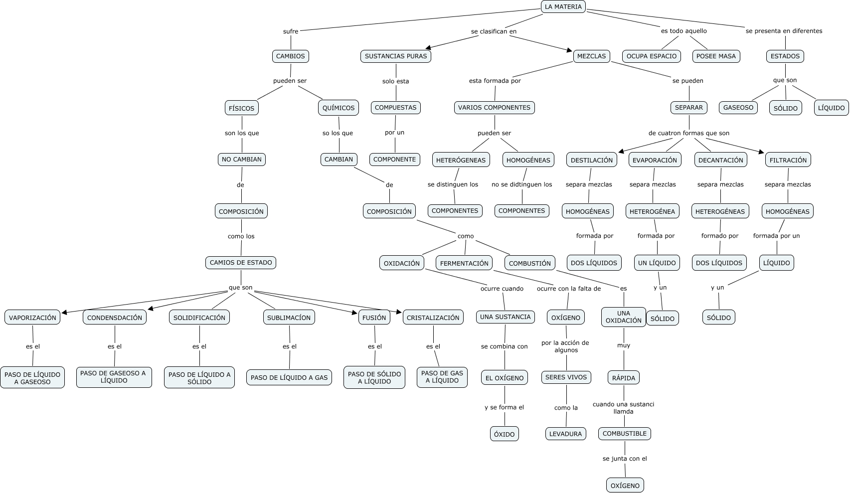 Este Cmap, tiene información relacionada con: LA MATERIA-Pablo, NO CAMBIAN de COMPOSICIÓN, VAPORIZACIÓN es el PASO DE LÍQUIDO A GASEOSO, DECANTACIÓN separa mezclas HETEROGÉNEAS, FILTRACIÓN separa mezclas HOMOGÉNEAS, UNA SUSTANCIA se combina con EL OXÍGENO, SERES VIVOS como la LEVADURA, FUSIÓN es el PASO DE SÓLIDO A LÍQUIDO, MEZCLAS esta formada por VARIOS COMPONENTES, LA MATERIA es todo aquello OCUPA ESPACIO, DESTILACIÓN separa mezclas HOMOGÉNEAS, HOMOGÉNEAS formada por un LÍQUIDO, VARIOS COMPONENTES pueden ser HOMOGÉNEAS, SEPARAR de cuatron formas que son FILTRACIÓN, COMBUSTIBLE se junta con el OXÍGENO, COMPOSICIÓN como OXIDACIÓN, HOMOGÉNEAS formada por DOS LÍQUIDOS, CAMIOS DE ESTADO que son VAPORIZACIÓN, LA MATERIA es todo aquello POSEE MASA, SOLIDIFICACIÓN es el PASO DE LÍQUIDO A SÓLIDO, ESTADOS que son LÍQUIDO