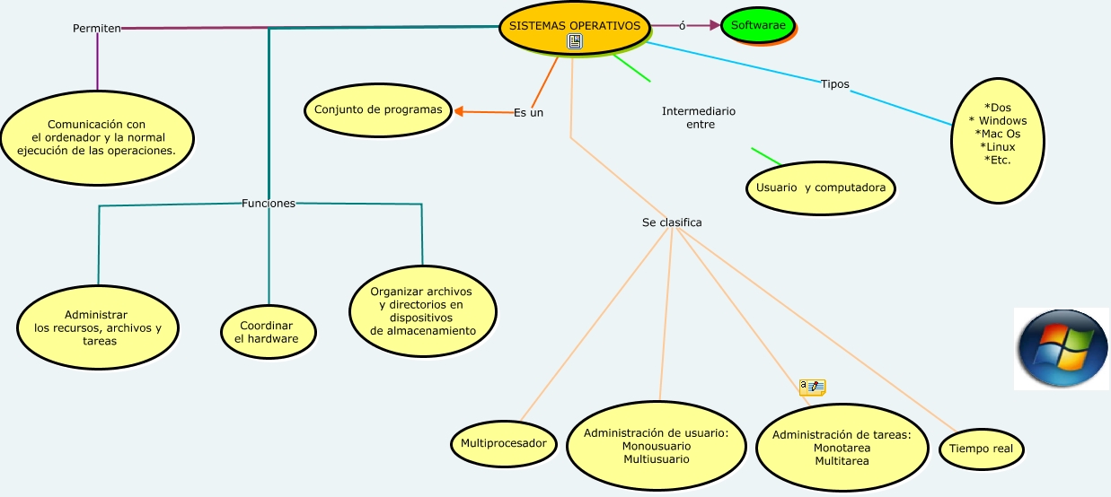 Este Cmap, tiene información relacionada con: Sistemas operativos, SISTEMAS OPERATIVOS Es un Conjunto de programas, SISTEMAS OPERATIVOS Tipos *Dos * Windows *Mac Os *Linux *Etc., SISTEMAS OPERATIVOS ó Softwarae, SISTEMAS OPERATIVOS Se clasifica Administración de tareas: Monotarea Multitarea, SISTEMAS OPERATIVOS Se clasifica Multiprocesador, SISTEMAS OPERATIVOS Funciones Coordinar el hardware, SISTEMAS OPERATIVOS Permiten Comunicación con el ordenador y la normal ejecución de las operaciones., SISTEMAS OPERATIVOS Se clasifica Tiempo real, SISTEMAS OPERATIVOS Intermediario entre Usuario y computadora, SISTEMAS OPERATIVOS Funciones Organizar archivos y directorios en dispositivos de almacenamiento, SISTEMAS OPERATIVOS Se clasifica Administración de usuario: Monousuario Multiusuario, SISTEMAS OPERATIVOS Funciones Administrar los recursos, archivos y tareas