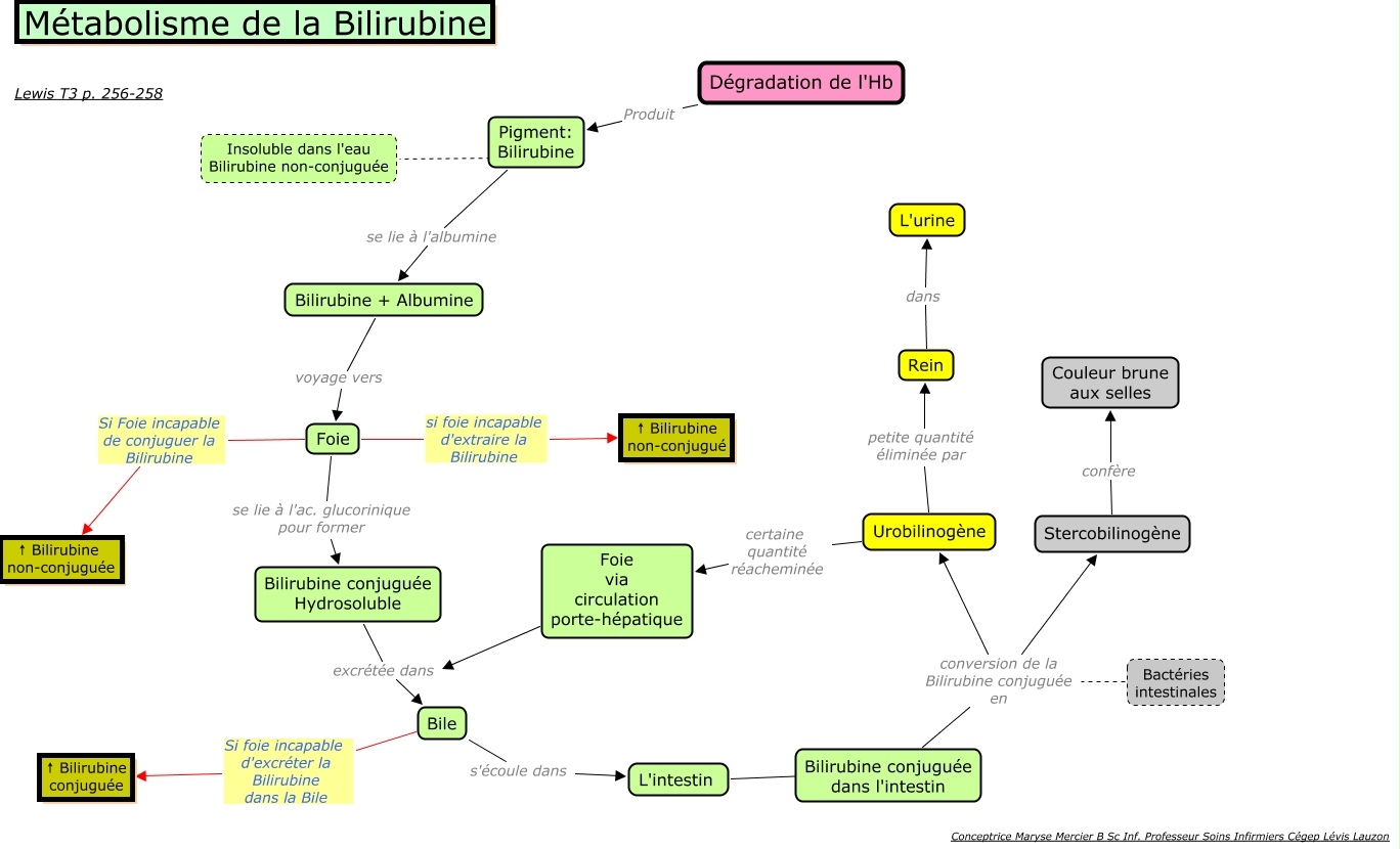 Cette carte de concepts créée avec IHMC CmapTools traite de: Métabolisme de la bilirubine, Bilirubine conjuguée dans l'intestin conversion de la Bilirubine conjuguée en Stercobilinogène, Foie via circulation porte-hépatique excrétée dans Bile, Urobilinogène petite quantité éliminée par Rein, Bile s'écoule dans L'intestin, L'intestin ???? Bilirubine conjuguée dans l'intestin, Bilirubine conjuguée dans l'intestin conversion de la Bilirubine conjuguée en Urobilinogène, Bactéries intestinales conversion de la Bilirubine conjuguée en Urobilinogène, Stercobilinogène confère Couleur brune aux selles, Urobilinogène certaine quantité réacheminée Foie via circulation porte-hépatique, Bilirubine conjuguée Hydrosoluble excrétée dans Bile, Foie si foie incapable d'extraire la Bilirubine ↑ Bilirubine non-conjugué, Pigment: Bilirubine ???? Insoluble dans l'eau Bilirubine non-conjuguée, Rein dans L'urine, Bilirubine + Albumine voyage vers Foie, Foie se lie à l'ac. glucorinique pour former Bilirubine conjuguée Hydrosoluble, Bile Si foie incapable d'excréter la Bilirubine dans la Bile ↑ Bilirubine conjuguée, Bactéries intestinales conversion de la Bilirubine conjuguée en Stercobilinogène, Pigment: Bilirubine se lie à l'albumine Bilirubine + Albumine, Dégradation de l'Hb Produit Pigment: Bilirubine, Foie Si Foie incapable de conjuguer la Bilirubine ↑ Bilirubine non-conjuguée