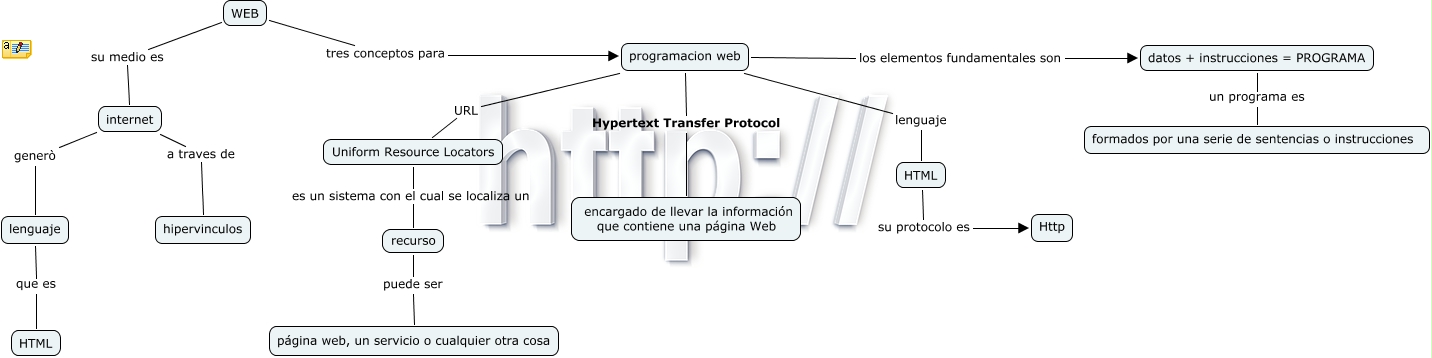 This Concept Map, created with IHMC CmapTools, has information related to: WEB, recurso puede ser página web, un servicio o cualquier otra cosa, WEB tres conceptos para programacion web, programacion web Hypertext Transfer Protocol encargado de llevar la información que contiene una página Web, Uniform Resource Locators es un sistema con el cual se localiza un recurso, programacion web URL Uniform Resource Locators, WEB su medio es internet, internet generò lenguaje, HTML su protocolo es Http, programacion web los elementos fundamentales son datos + instrucciones = PROGRAMA, internet a traves de hipervinculos, programacion web lenguaje HTML, datos + instrucciones = PROGRAMA un programa es formados por una serie de sentencias o instrucciones, lenguaje que es HTML