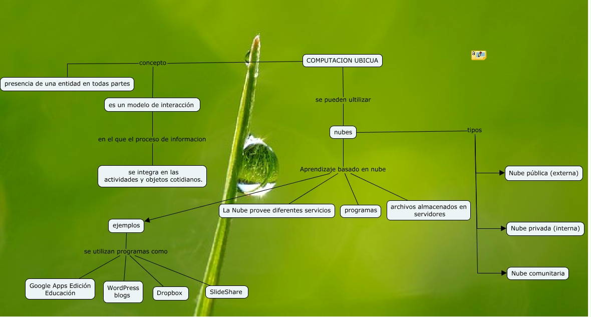 Este Cmap, tiene información relacionada con: Ubicuidad, ejemplos se utilizan programas como WordPress blogs, nubes Aprendizaje basado en nube ejemplos, nubes Aprendizaje basado en nube La Nube provee diferentes servicios, nubes tipos Nube comunitaria, COMPUTACION UBICUA concepto es un modelo de interacción, nubes Aprendizaje basado en nube programas, COMPUTACION UBICUA se pueden ultilizar nubes, ejemplos se utilizan programas como SlideShare, ejemplos se utilizan programas como Google Apps Edición Educación, nubes tipos Nube pública (externa), nubes tipos Nube privada (interna), ejemplos se utilizan programas como Dropbox, es un modelo de interacción en el que el proceso de informacion se integra en las actividades y objetos cotidianos., nubes Aprendizaje basado en nube archivos almacenados en servidores, COMPUTACION UBICUA concepto presencia de una entidad en todas partes