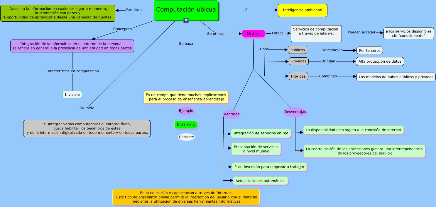 Este Cmap, tiene información relacionada con: ubicuidad, Computación ubicua Concepeto Integración de la informática en el entorno de la persona, se refiere en general a la presencia de una entidad en todas partes, Computación ubicua Se basa Es un campo que tiene muchas implicaciones para el proceso de enseñanza-aprendizaje, Computación ubicua Se utilizan Nubes, Nubes Ventajas Presentación de servicios a nivel mundial, Es un campo que tiene muchas implicaciones para el proceso de enseñanza-aprendizaje Ejemplo E learning, Nubes Tipos Privadas, Nubes Desventajas La centralización de las aplicaciones genera una interdependencia de los proveedores del servicio, Computación ubicua ó Inteligencia ambiental, Nubes Tipos Públicas, Computación ubicua Permite el Acceso a la información en cualquier lugar o momento, la interacción con pares y la oportunidad de aprendizaje desde una variedad de fuentes., E learning Consiste En la educación y capacitación a través de Internet. Este tipo de enseñanza online permite la interacción del usuario con el material mediante la utilización de diversas herramientas informáticas., Públicas Se manejan Por terceros, Privadas Brindan Alta protección de datos, Nubes Ventajas Integración de servicios en red, Computación ubicua Su meta Es integrar varias computadoras al entorno físico, busca habilitar los beneficios de éstas y de la información digitalizada en todo momento y en todas partes., Nubes Ventajas Poca inversión para empezar a trabajar, Híbridas Combinan Los modelos de nubes públicas y privadas, Nubes Desventajas La disponibilidad esta sujeta a la conexión de internet, Nubes Tipos Híbridas, Servicios de computación a través de internet Pueden acceder a los servicios disponibles sin "conocimiento"