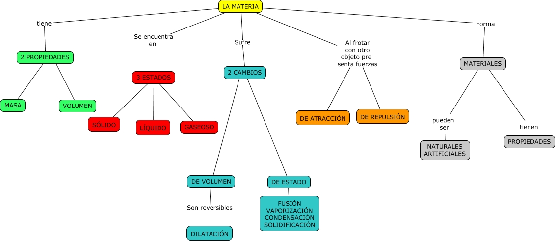 Este Cmap, tiene información relacionada con: LA MATERIA - Andrea y Noelia, LA MATERIA Al frotar con otro objeto pre- senta fuerzas DE ATRACCIÓN, LA MATERIA tiene 2 PROPIEDADES, tienen ???? PROPIEDADES, 2 CAMBIOS ???? DE VOLUMEN, 3 ESTADOS ???? SÓLIDO, 3 ESTADOS ???? LÍQUIDO, LA MATERIA Sufre 2 CAMBIOS, 2 PROPIEDADES ???? VOLUMEN, 3 ESTADOS ???? GASEOSO, 3 ESTADOS ???? GASEOSO, 2 CAMBIOS ???? DE ESTADO, LA MATERIA Al frotar con otro objeto pre- senta fuerzas DE REPULSIÓN, DE ESTADO ???? FUSIÓN VAPORIZACIÓN CONDENSACIÓN SOLIDIFICACIÓN, LA MATERIA Forma MATERIALES, MATERIALES ???? pueden ser, LA MATERIA Se encuentra en 3 ESTADOS, 2 PROPIEDADES ???? MASA, DE VOLUMEN Son reversibles DILATACIÓN, MATERIALES ???? tienen, pueden ser ???? NATURALES ARTIFICIALES
