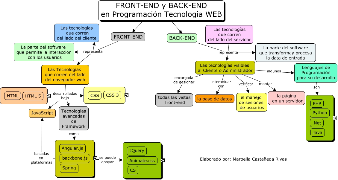 Este Cmap, tiene información relacionada con: Fron-End y Back-End, FRONT-END y BACK-END en Programación Tecnología WEB ???? FRONT-END, BACK-END representa La parte del software que transformay procesa la data de entrada, Las tecnologías visibles al Cliente o Administrador algunos Lenguajes de Programación para su desarrollo, Tecnologías avanzadas de Framework como ????, Las Tecnologías que corren del lado del navegador web desarrolladas bajo ????, Las tecnologías visibles al Cliente o Administrador encargada de gesionar todas las vistas front-end, FRONT-END representa Las tecnologías que corren del lado del cliente, Las tecnologías visibles al Cliente o Administrador verificar el manejo de sesiones de usuarios, Las Tecnologías que corren del lado del navegador web desarrolladas bajo ????, FRONT-END representa La parte del software que permite la interacción con los usuarios, ???? se puede apoyar ????, Las tecnologías visibles al Cliente o Administrador montar la página en un servidor, Lenguajes de Programación para su desarrollo son ????, BACK-END representa Las tecnologías visibles al Cliente o Administrador, BACK-END representa Las tecnologías que corren del lado del servidor, ???? basadas en plataformas JavaScript, Las Tecnologías que corren del lado del navegador web desarrolladas bajo Tecnologías avanzadas de Framework, FRONT-END y BACK-END en Programación Tecnología WEB ???? BACK-END, Las Tecnologías que corren del lado del navegador web desarrolladas bajo JavaScript, Las tecnologías visibles al Cliente o Administrador interactuar con la base de datos