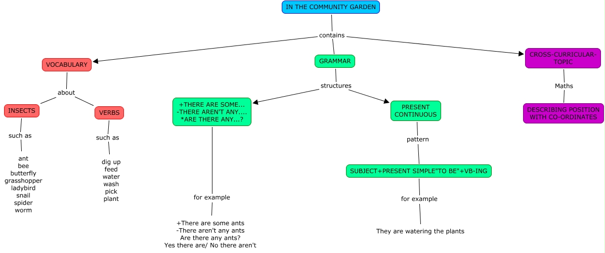 Este Cmap, tiene información relacionada con: IN THE COMMUNITY GARDEN-(Carmen e Irene), GRAMMAR structures PRESENT CONTINUOUS, PRESENT CONTINUOUS pattern SUBJECT+PRESENT SIMPLE"TO BE"+VB-ING, INSECTS such as ant bee butterfly grasshopper ladybird snail spider worm, VERBS such as dig up feed water wash pick plant, IN THE COMMUNITY GARDEN contains VOCABULARY, VOCABULARY about INSECTS, SUBJECT+PRESENT SIMPLE"TO BE"+VB-ING for example They are watering the plants, +THERE ARE SOME... -THERE AREN'T ANY.... *ARE THERE ANY...? for example +There are some ants -There aren't any ants Are there any ants? Yes there are/ No there aren't, GRAMMAR structures +THERE ARE SOME... -THERE AREN'T ANY.... *ARE THERE ANY...?, IN THE COMMUNITY GARDEN contains CROSS-CURRICULAR- TOPIC, VOCABULARY about VERBS, IN THE COMMUNITY GARDEN contains GRAMMAR, CROSS-CURRICULAR- TOPIC Maths DESCRIBING POSITION WITH CO-ORDINATES