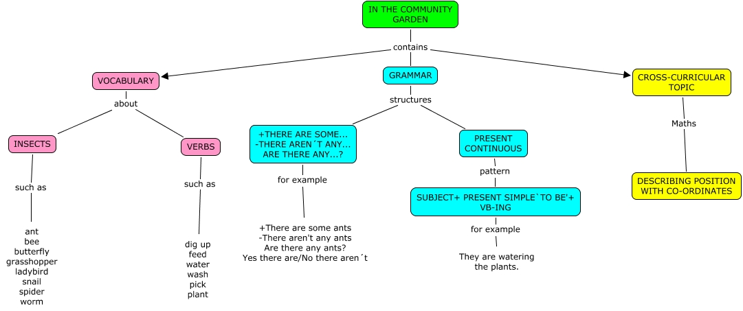 Este Cmap, tiene información relacionada con: IN THE COMMUNITY GARDEN-(jaime y amira), CROSS-CURRICULAR TOPIC Maths DESCRIBING POSITION WITH CO-ORDINATES, GRAMMAR structures +THERE ARE SOME... -THERE AREN´T ANY... ARE THERE ANY...?, IN THE COMMUNITY GARDEN contains VOCABULARY, PRESENT CONTINUOUS pattern SUBJECT+ PRESENT SIMPLE`TO BE'+ VB-ING, IN THE COMMUNITY GARDEN contains GRAMMAR, IN THE COMMUNITY GARDEN contains CROSS-CURRICULAR TOPIC, SUBJECT+ PRESENT SIMPLE`TO BE'+ VB-ING for example They are watering the plants., GRAMMAR structures PRESENT CONTINUOUS, VOCABULARY about INSECTS, VERBS such as dig up feed water wash pick plant, +THERE ARE SOME... -THERE AREN´T ANY... ARE THERE ANY...? for example +There are some ants -There aren't any ants Are there any ants? Yes there are/No there aren´t, INSECTS such as ant bee butterfly grasshopper ladybird snail spider worm, VOCABULARY about VERBS