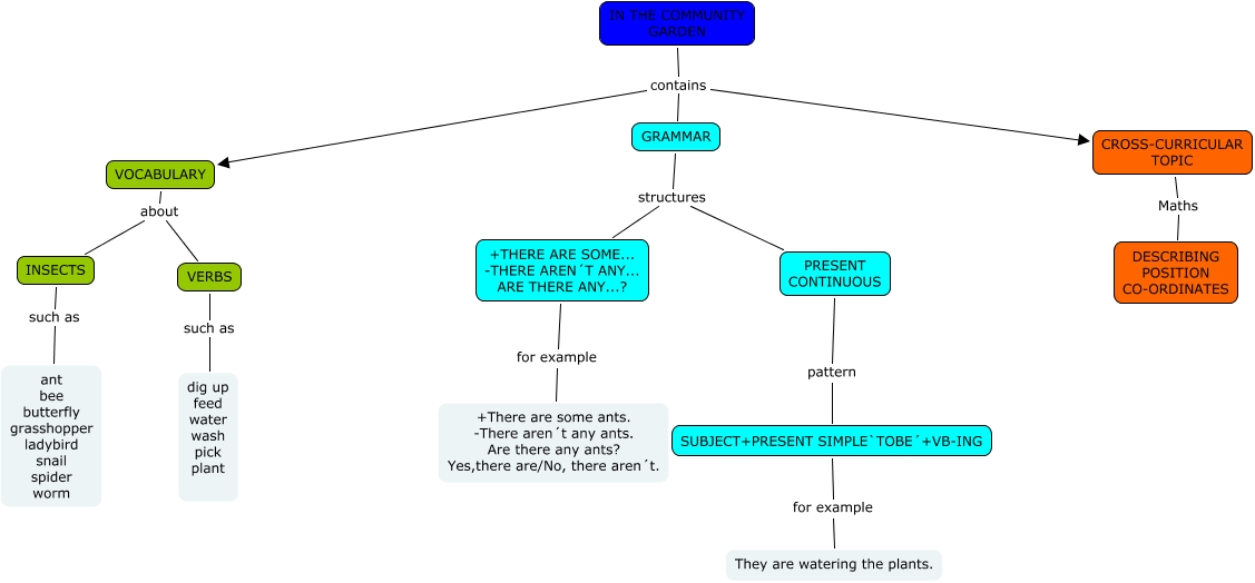 Este Cmap, tiene información relacionada con: IN THE COMMUNITY GARDEN-Marcos y Sofía, PRESENT CONTINUOUS pattern SUBJECT+PRESENT SIMPLE`TOBE´+VB-ING, IN THE COMMUNITY GARDEN contains CROSS-CURRICULAR TOPIC, GRAMMAR structures +THERE ARE SOME... -THERE AREN´T ANY... ARE THERE ANY...?, VOCABULARY about INSECTS, GRAMMAR structures PRESENT CONTINUOUS, +THERE ARE SOME... -THERE AREN´T ANY... ARE THERE ANY...? for example +There are some ants. -There aren´t any ants. Are there any ants? Yes,there are/No, there aren´t., VOCABULARY about VERBS, IN THE COMMUNITY GARDEN contains GRAMMAR, CROSS-CURRICULAR TOPIC Maths DESCRIBING POSITION CO-ORDINATES, IN THE COMMUNITY GARDEN contains VOCABULARY, VERBS such as dig up feed water wash pick plant, SUBJECT+PRESENT SIMPLE`TOBE´+VB-ING for example They are watering the plants., INSECTS such as ant bee butterfly grasshopper ladybird snail spider worm