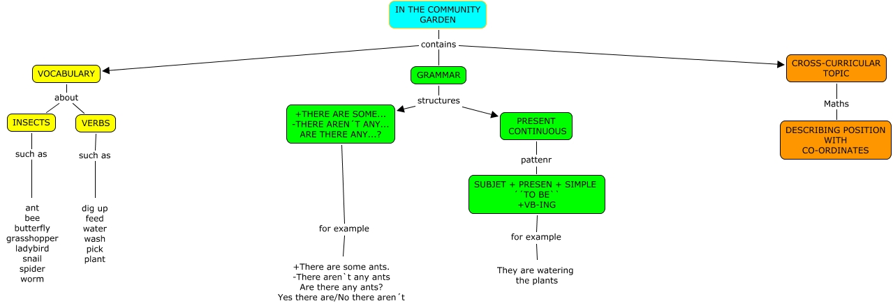 Este Cmap, tiene información relacionada con: IN THE COMMUNITY GARDEN Daniel y Hugo, SUBJET + PRESEN + SIMPLE ´´TO BE`` +VB-ING for example They are watering the plants, IN THE COMMUNITY GARDEN contains CROSS-CURRICULAR TOPIC, VOCABULARY about VERBS, +THERE ARE SOME... -THERE AREN´T ANY... ARE THERE ANY...? for example +There are some ants. -There aren`t any ants Are there any ants? Yes there are/No there aren´t, VOCABULARY about INSECTS, IN THE COMMUNITY GARDEN contains VOCABULARY, VERBS such as dig up feed water wash pick plant, IN THE COMMUNITY GARDEN contains GRAMMAR, CROSS-CURRICULAR TOPIC Maths DESCRIBING POSITION WITH CO-ORDINATES, PRESENT CONTINUOUS pattenr SUBJET + PRESEN + SIMPLE ´´TO BE`` +VB-ING, GRAMMAR structures PRESENT CONTINUOUS, GRAMMAR structures +THERE ARE SOME... -THERE AREN´T ANY... ARE THERE ANY...?, INSECTS such as ant bee butterfly grasshopper ladybird snail spider worm