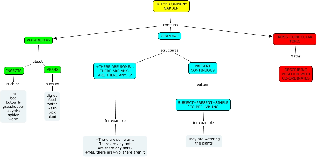 Este Cmap, tiene información relacionada con: IN THE COMMUNITY GARDEN-Alejandra ybYago, PRESENT CONTINUOUS pattern SUBJECT+PRESENT+SIMPLE `TO BE´+VB-ING, GRAMMAR structures +THERE ARE SOME... -THERE ARE ANY... ARE THERE ANY...?, INSECTS such as ant bee butterfly grasshopper ladybird spider worm, +THERE ARE SOME... -THERE ARE ANY... ARE THERE ANY...? for example +There are some ants -There are any ants Are there any ants? +Yes, there are/-No, there aren`t, VOCABULARY about VERBS, IN THE COMMUNY GARDEN contains GRAMMAR, IN THE COMMUNY GARDEN contains CROSS-CURRICULAR- TOPIC, SUBJECT+PRESENT+SIMPLE `TO BE´+VB-ING for example They are watering the plants, VERBS such as dig up feed water wash pick plant, GRAMMAR structures PRESENT CONTINUOUS, IN THE COMMUNY GARDEN contains VOCABULARY, VOCABULARY about INSECTS, CROSS-CURRICULAR- TOPIC Maths DESCRIBING POSITION WITH CO-ORDINATES